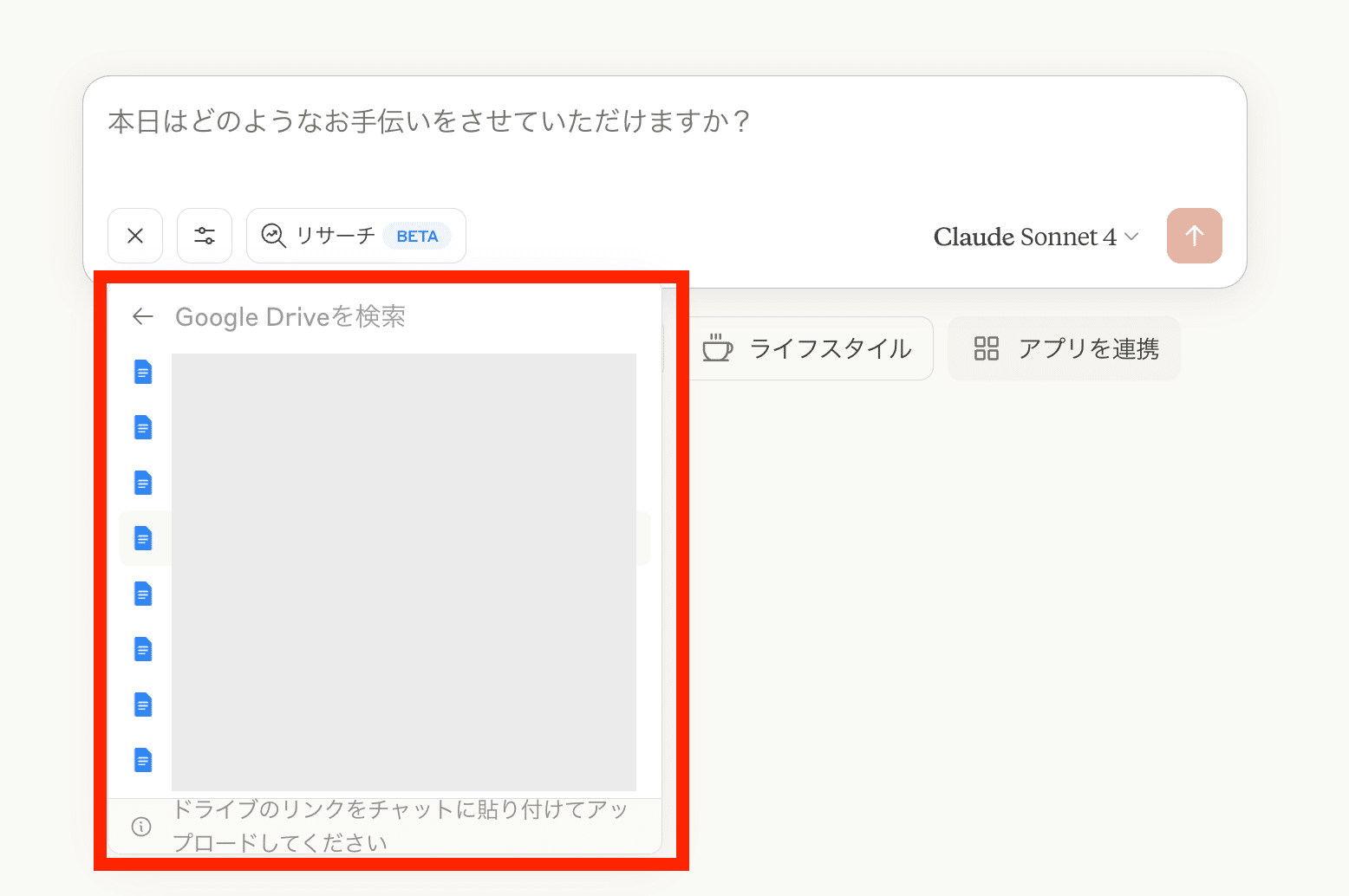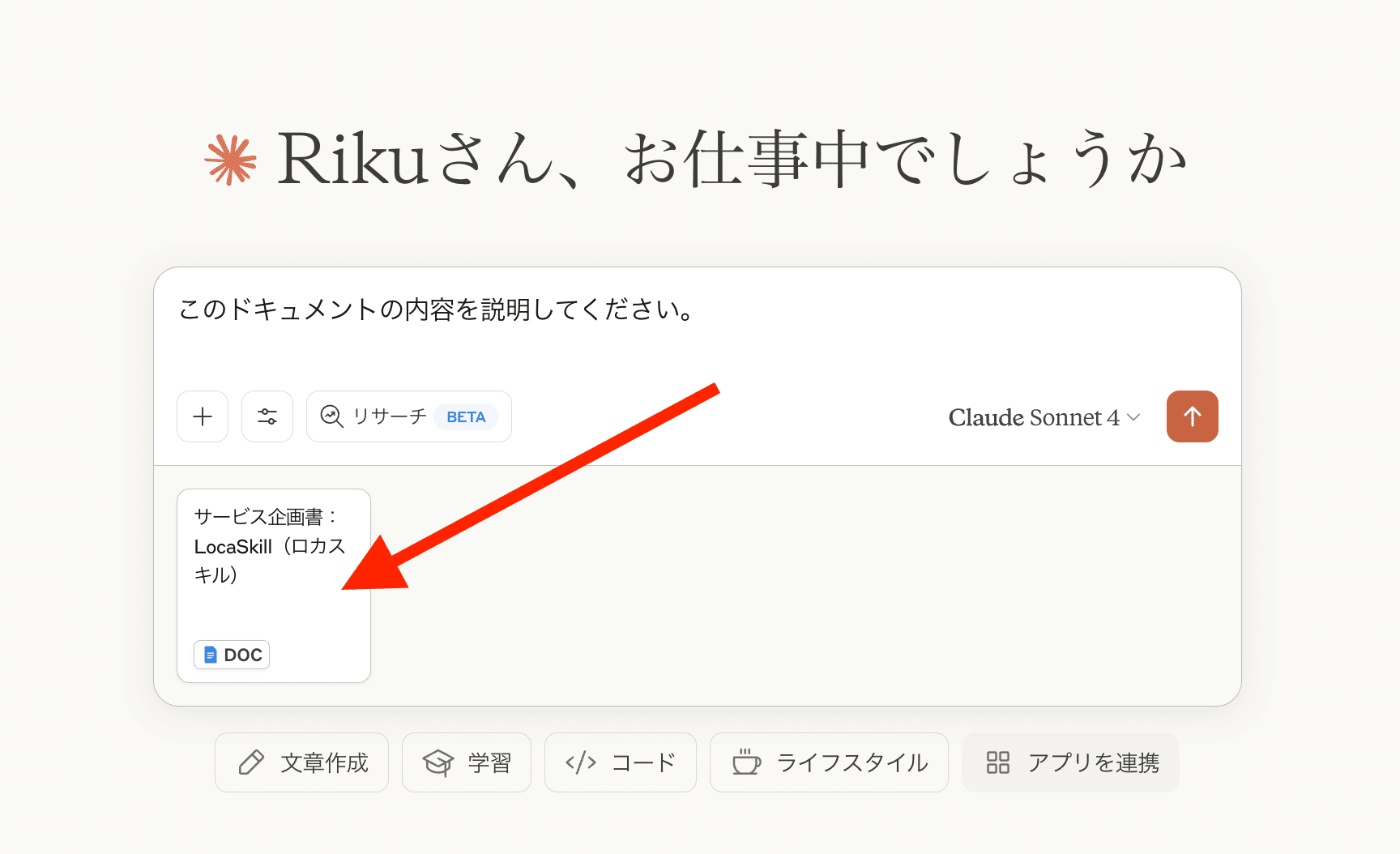 ドキュメントを選択すると、Claudeにアップロードすることができます。