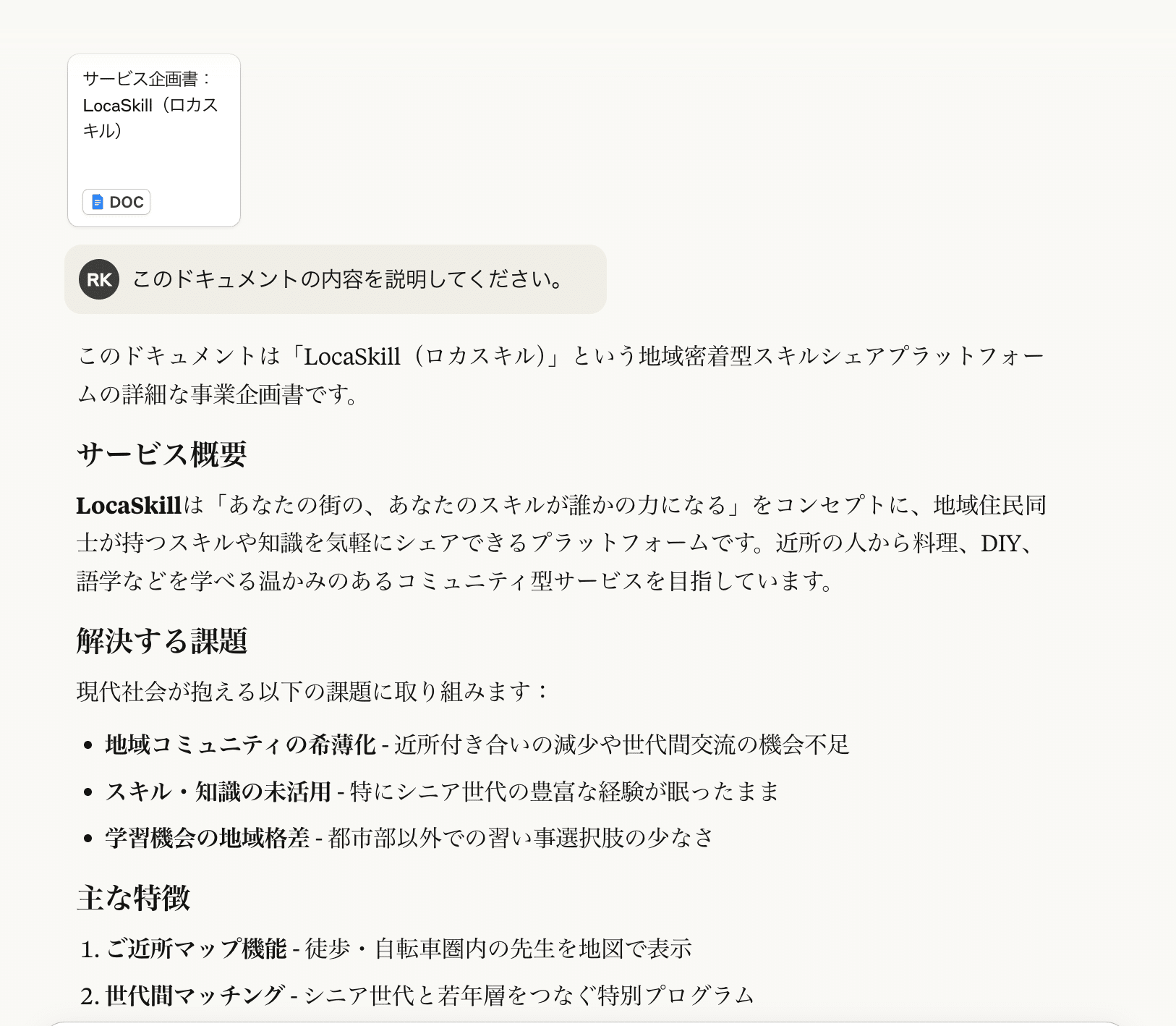 すると、選択したファイルがClaudeにアップロードされて、その内容を踏まえて質問することができます。