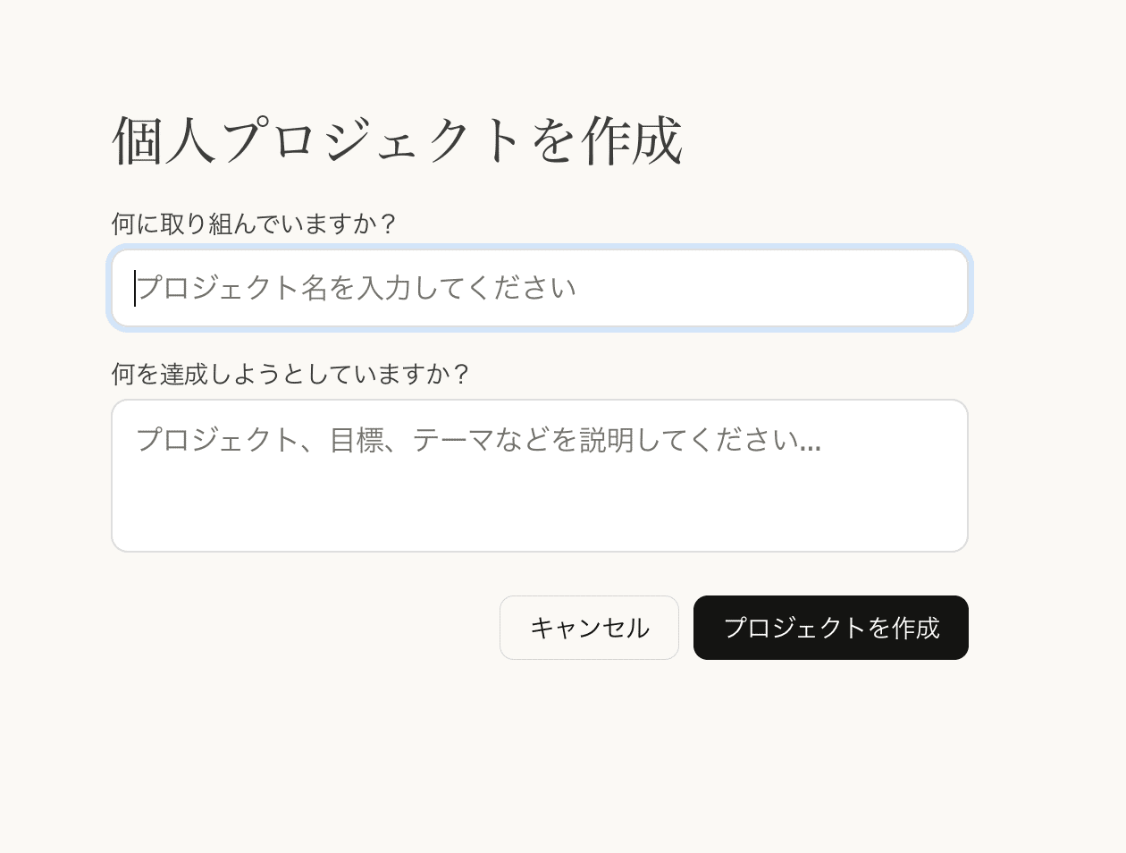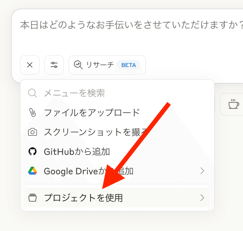 「プロジェクトを使用」を選択すると、プロジェクト機能を利用したチャットを使えます。