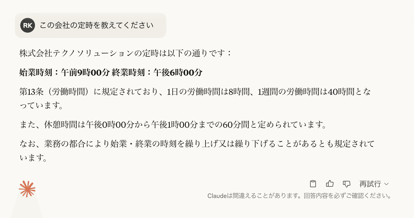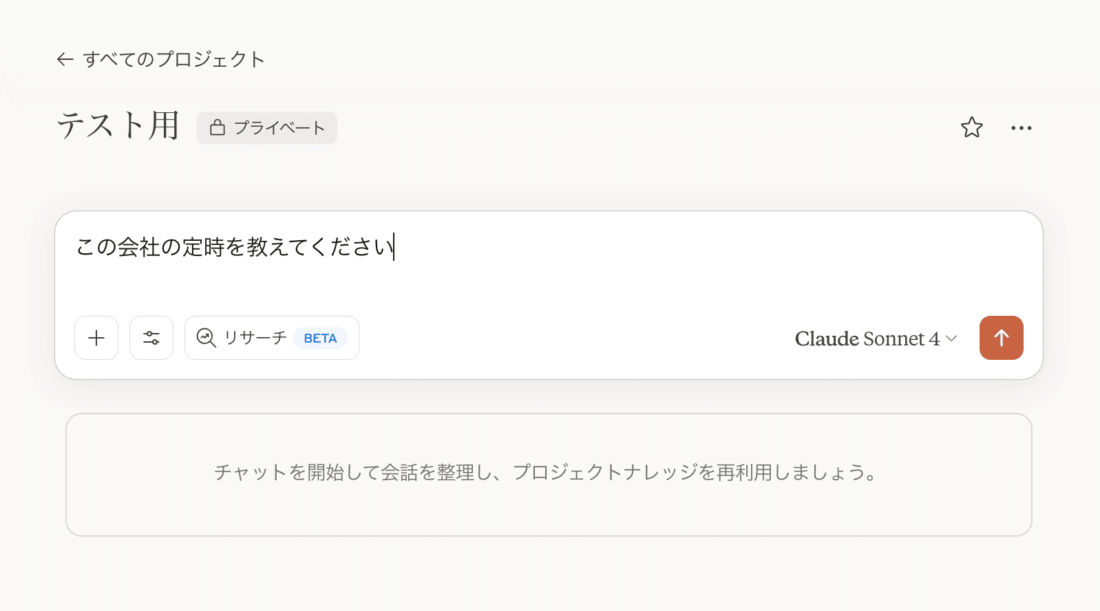 プロジェクト機能の解説パートで使用したプロジェクトで、再度会社の定時を質問するプロンプトを使用します。