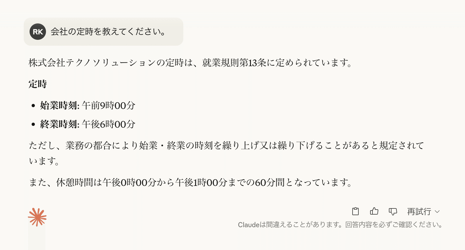 先ほどと同様に、ナレッジのファイルを参照して、正しい回答をしてくれました。