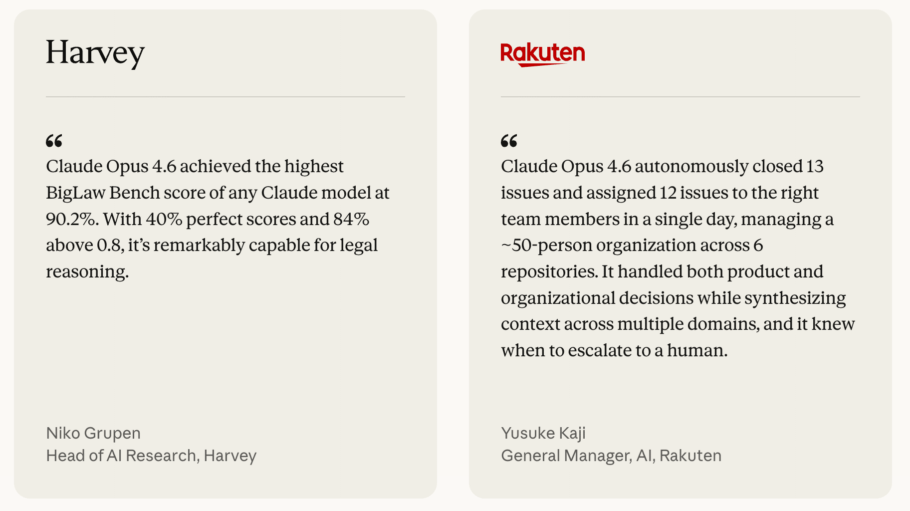 Rakutenは、約50名・6リポジトリにまたがる組織をOpus 4.6が自律的にマネジメントし、プロダクトと組織の両面で意思決定を行いながら、人間にエスカレーションすべきタイミングも判断したとしています。