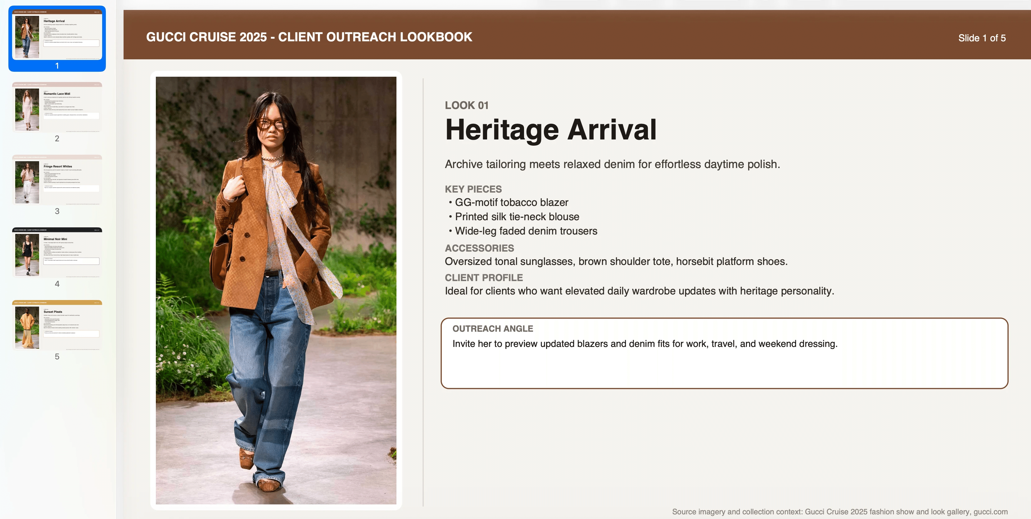 まず、あなたが選んだ2025年リゾートコレクションの中から、スタイリング済みのルックを4〜6スライドにまとめたPDFプレゼンテーションを作成してください。
