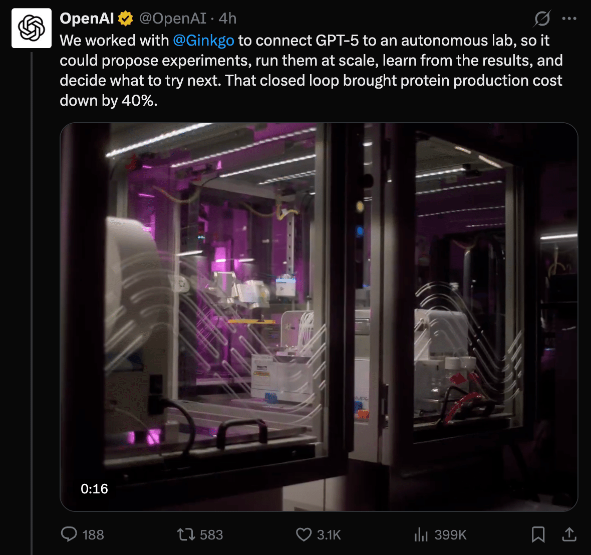 私たちは Ginkgo Bioworks と協力し、GPT-5 を自律型ラボに接続しました。これにより、AIが自ら実験を提案・大規模に実行し、その結果から学んで次の試行を決定できるようになりました。この一連のクローズドループ(自動循環)によって、タンパク質の生産コストを40%削減することに成功しました。