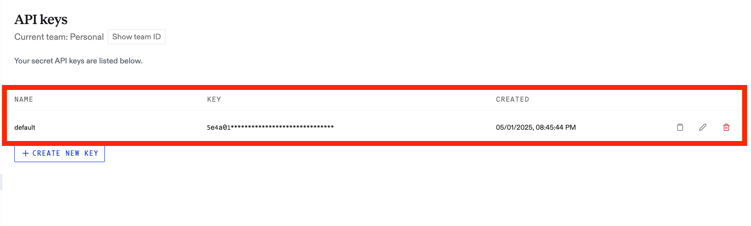 最初にdefaultのAPIキーが設定されています。APIキー(英数字の長いキー)をコピーして保存しておきます。このキーは後ほど設定ファイルに貼り付けます。