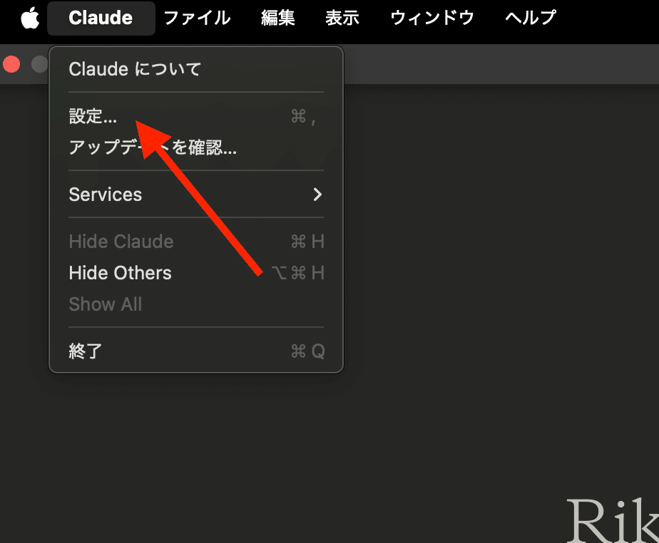 アプリ画面左上のメニューバーの「Claude」をクリックし、プルダウンから設定をクリックします。