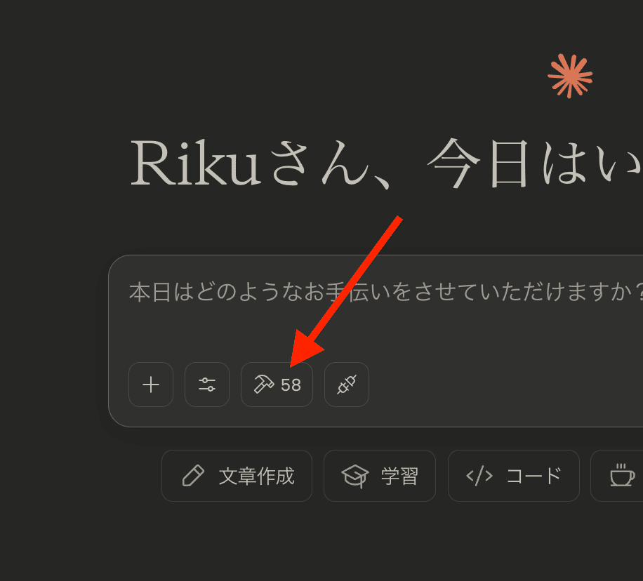 起動後、以下のトンカチのアイコンをクリックして、EXA MCPサーバーが正しく接続されたかを確認します。