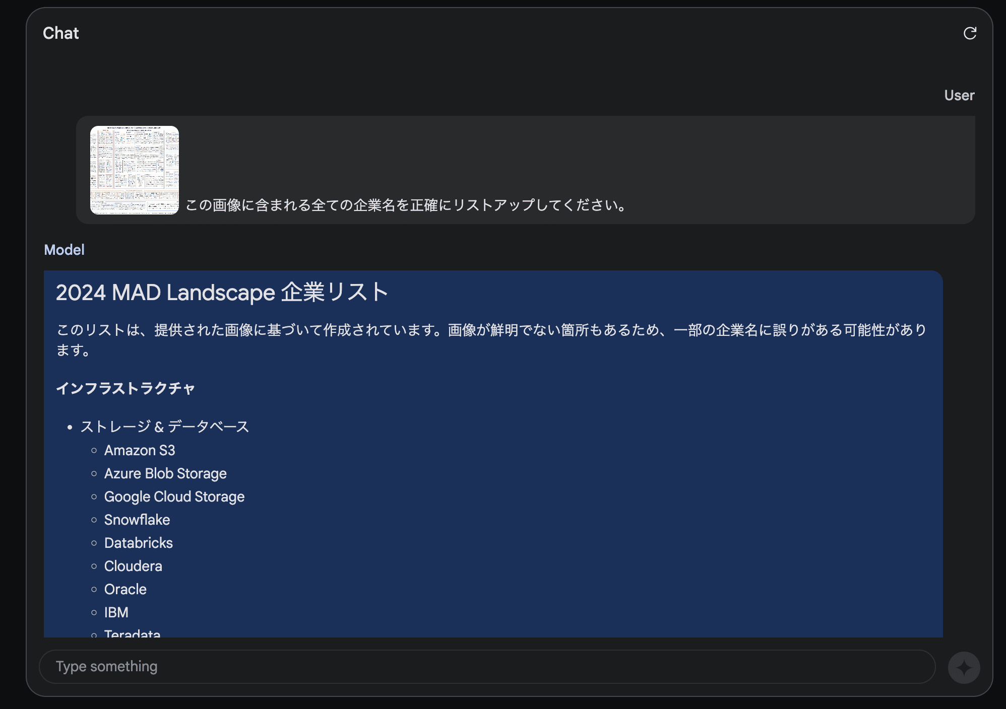 複雑で詳細な生成AI企業のカオスマップを解析したところ、わずか1分で企業名を正確に抽出することができました。