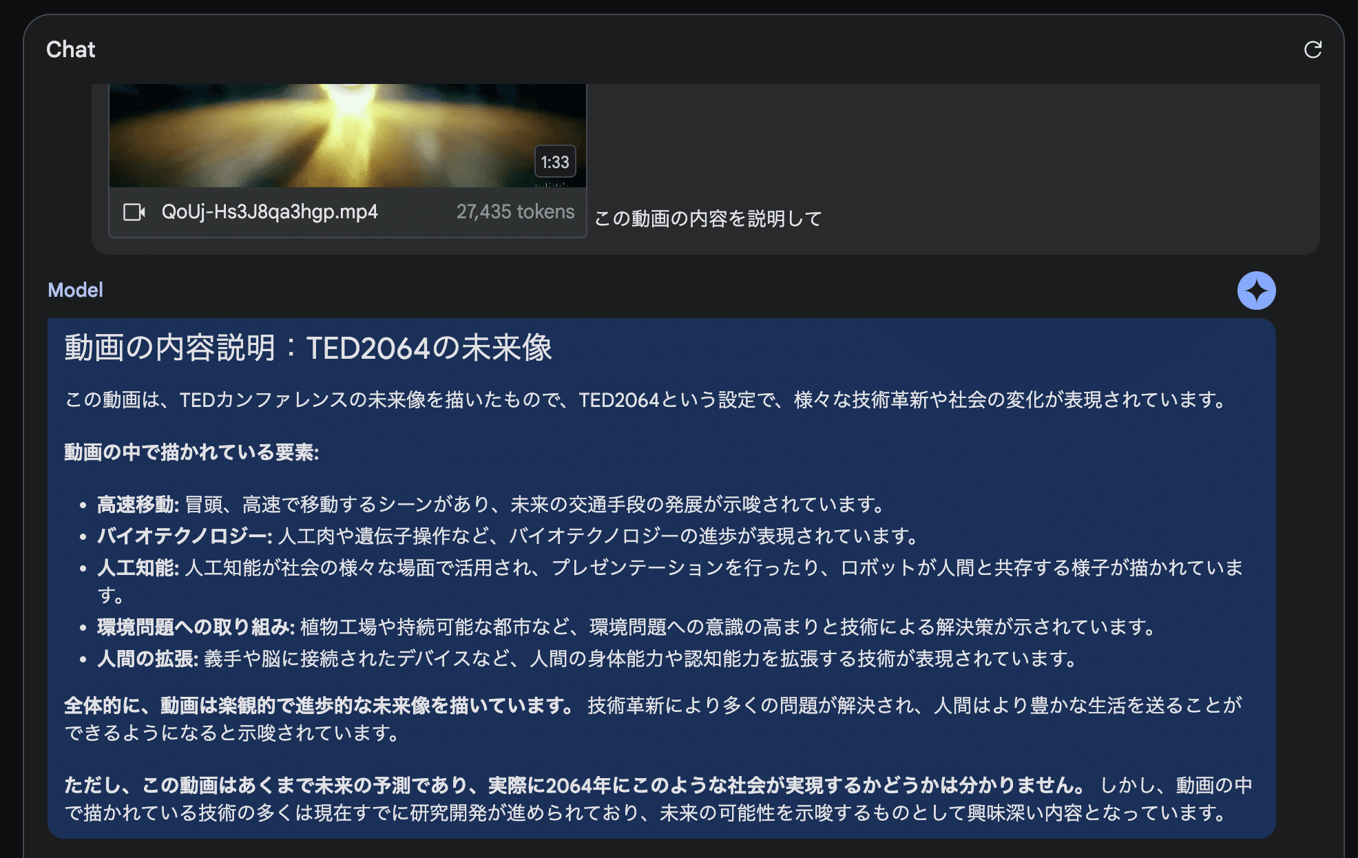 Gemini 1.5 Proは、OpenAIのSoraで生成された、未来のTEDを描いた1分半の動画を解析できました。