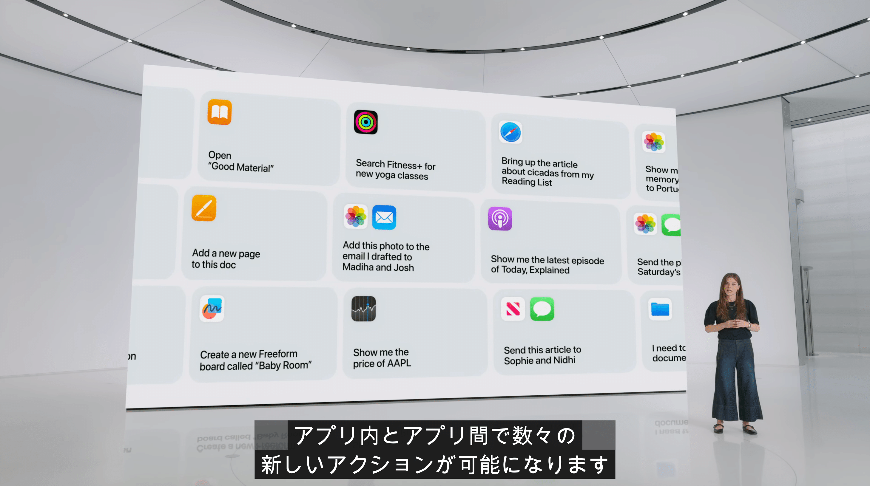 ③アプリ連携の強化: Apple Intelligenceは、iOS、iPadOS、macOSの様々なアプリと連携し、これまで以上に多くのタスクを実行できるようになりました。例えば、「昨日のミーティングで共有された資料を開いて」とSiriに頼めば、自動的にファイルアプリが開いて目的の資料を表示してくれます。