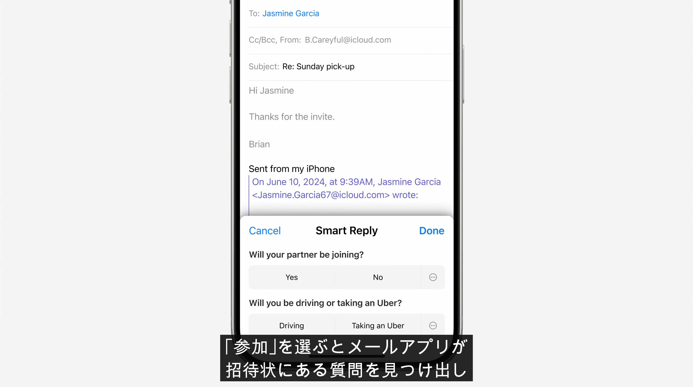 ② Smart Reply: 受信したメールに対して、状況に合わせた返信文を提案してくれる機能です。例えば、「今夜は予定があるので参加できません」や「参加します!楽しみです!」といった短文返信だけでなく、メールの内容を理解し、会議の参加可否や到着時間などを尋ねる質問に対して、最適な回答を選択肢で提示してくれます。