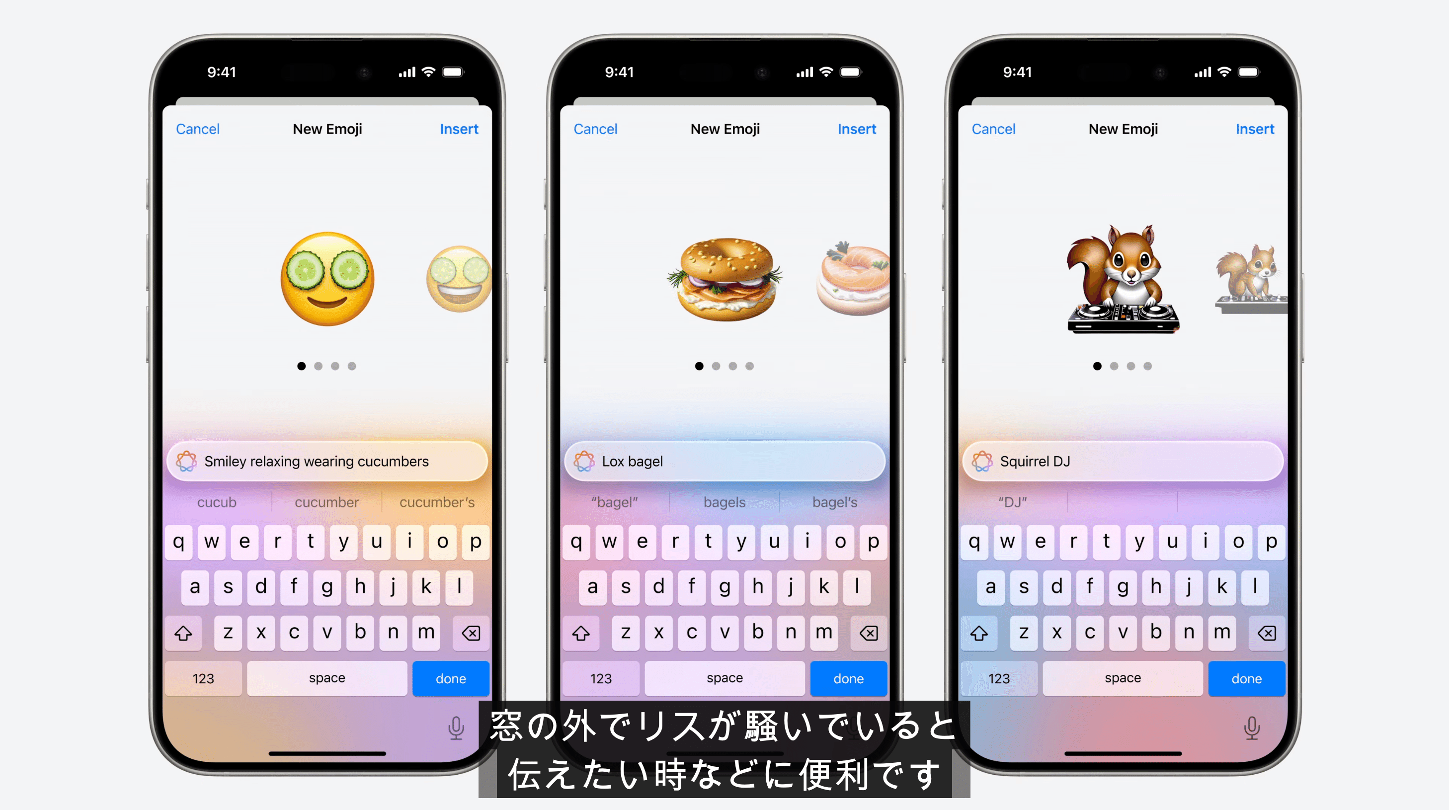 ① Genmoji:テキストからオリジナルの絵文字を生成してくれる機能です。メッセージアプリのステッカーやインライン絵文字としても使用可能です。
