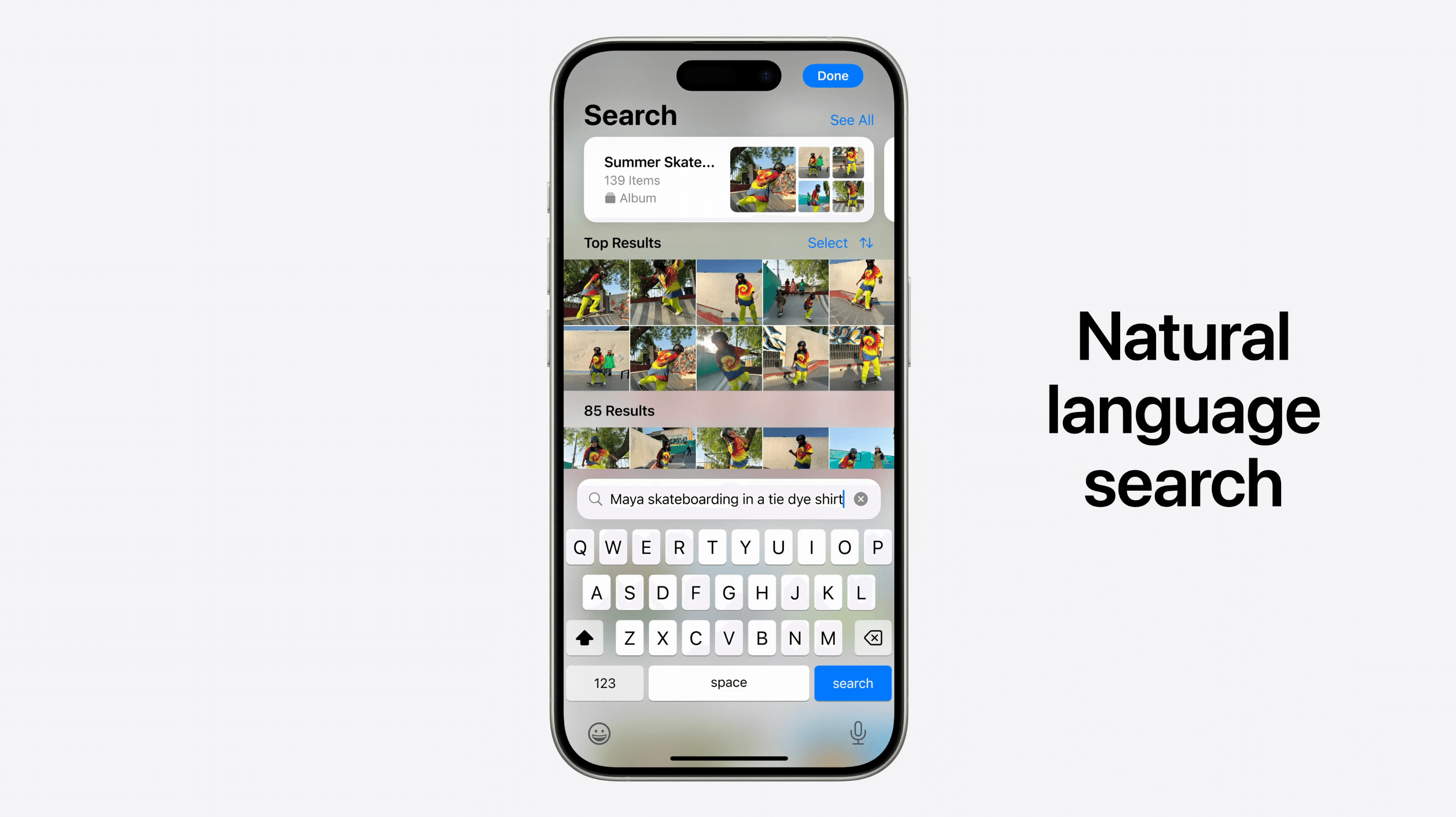 Apple Intelligenceは、写真の内容を理解し、人物、場所、イベントなど、様々な条件に合う写真、動画を自然言語で検索できるようにしてくれます。