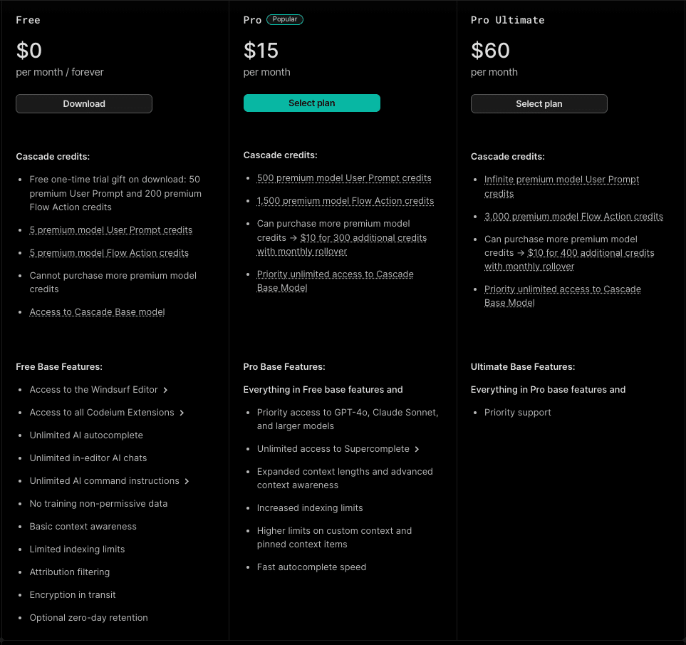 Windsurf Editorは、無料プランを含む複数の料金プランを提供しています。