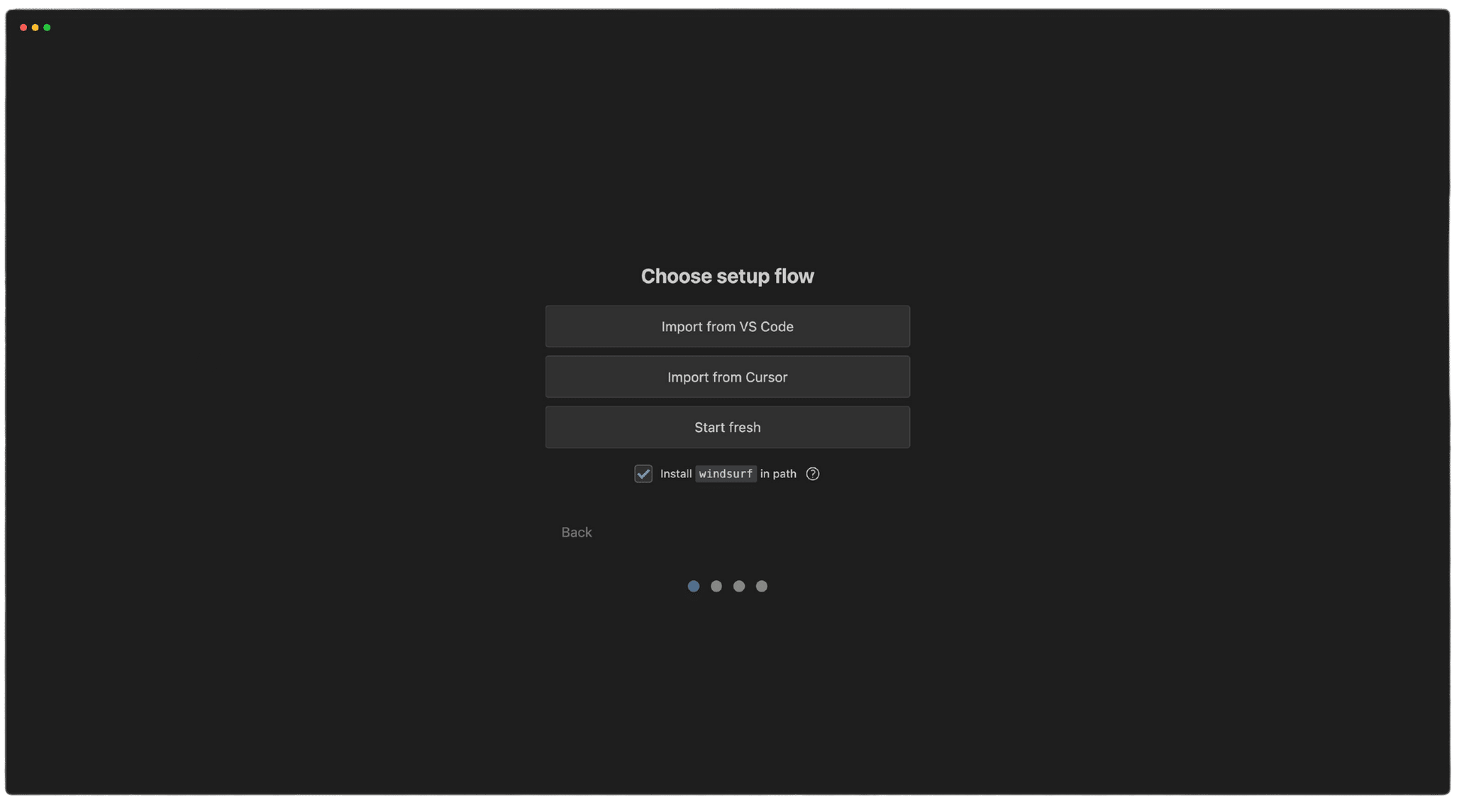 既にVS CodeやCursorを利用している場合は、設定をインポートすることができます。「Import from VS Code」または「Import from Cursor」を選択します。まっさらな状態で始める場合は、「Start fresh」を選択しましょう。