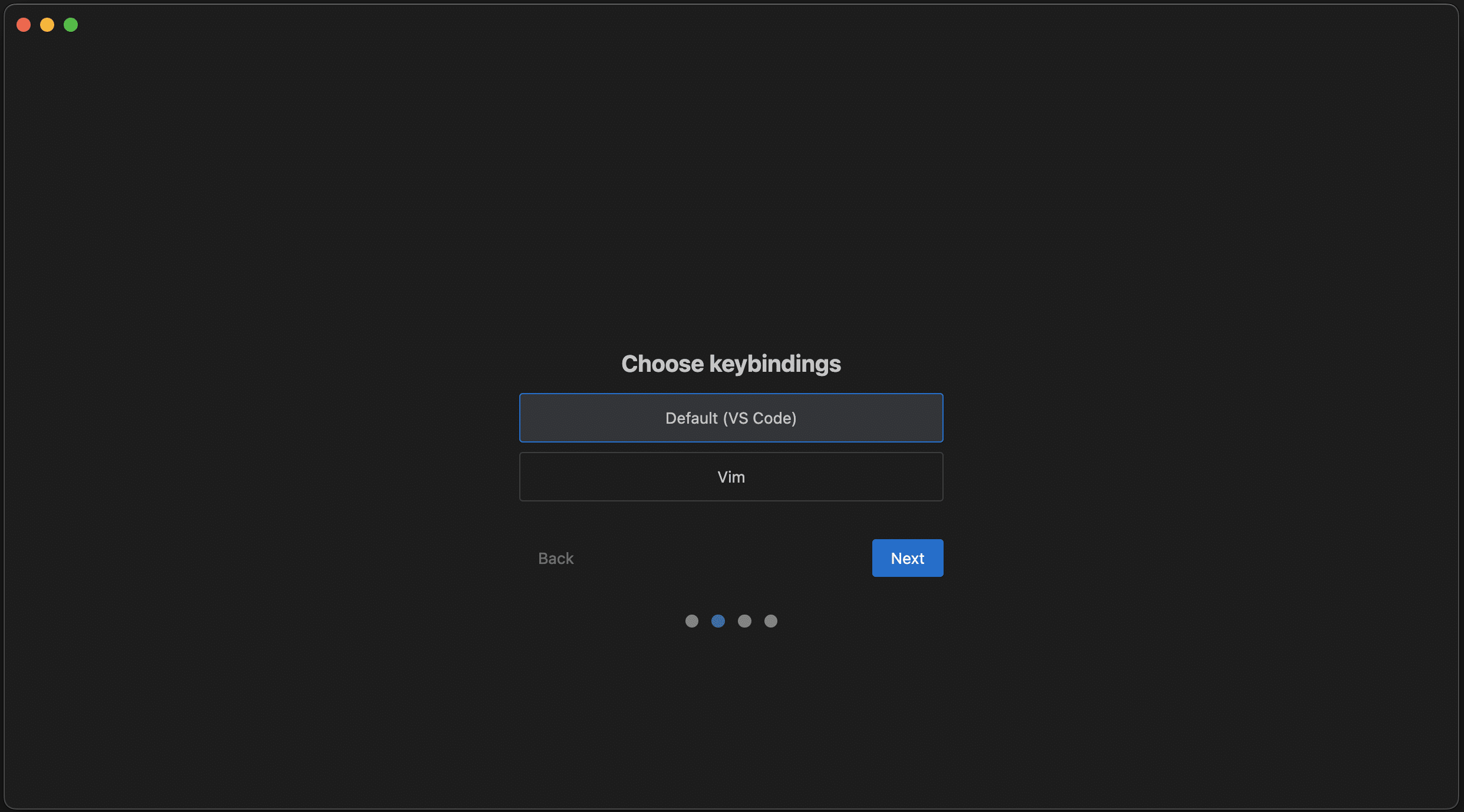 使い慣れたキーバインディングを選択します。VS Code風の操作にしたい場合は「VS Code」、Vim風の操作にしたい場合は「Vim」を選択します。