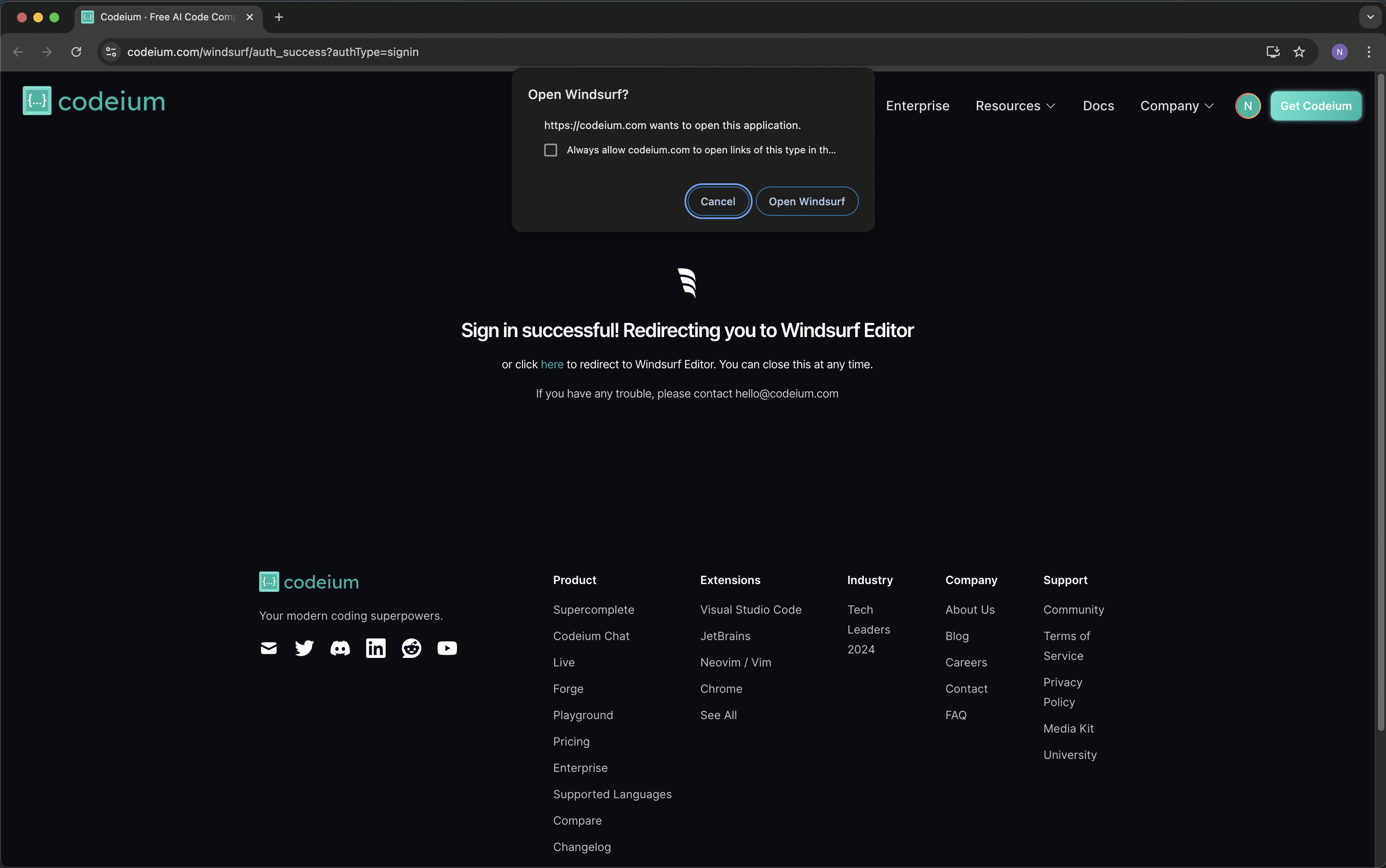 既にアカウントをお持ちの場合は、画面に指示にしたがい、「Open Windsurf」をクリックします。