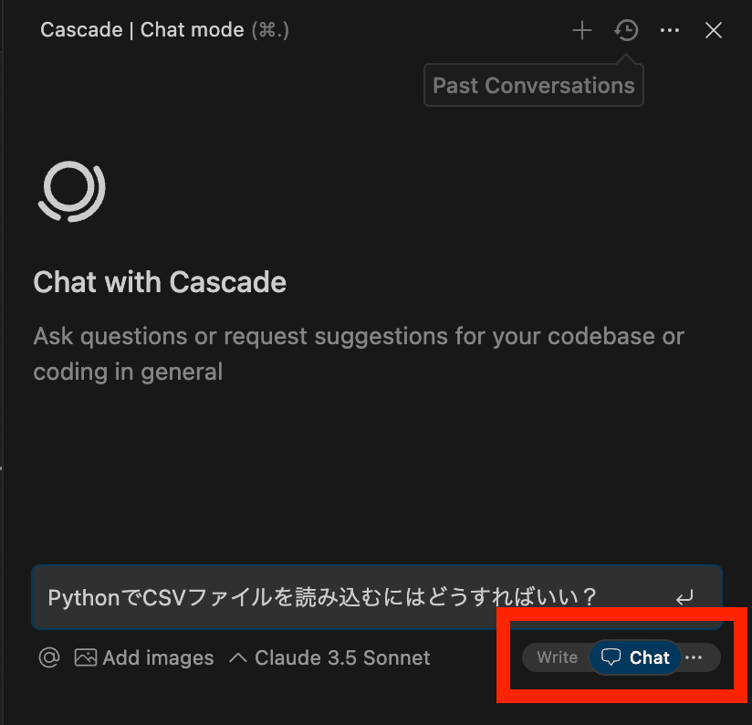 Chatモード: AIに技術的な質問をしたり、一般的なアドバイスを求めたりする際に使用します。