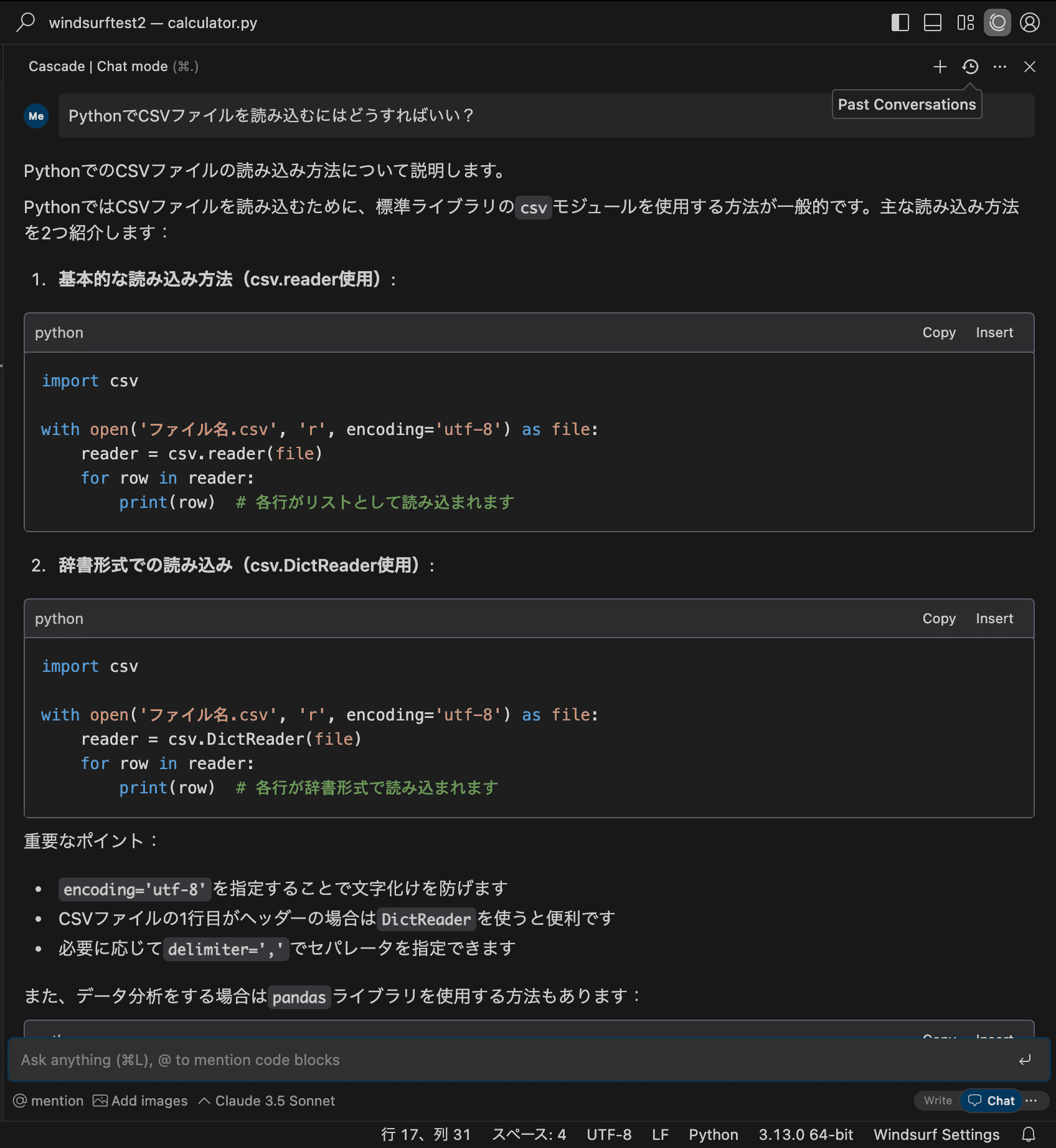 例:「PythonでCSVファイルを読み込むにはどうすればいい?」