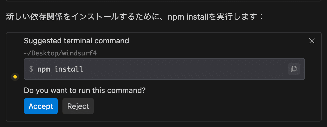 Cascadeは必要なパッケージのインストールコマンドを提案してくれて、「Accept」ボタンを押せば、そのコマンドが自動的に実行されます。