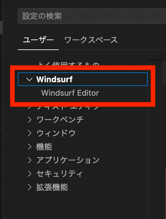 設定を開いたら、"Windsurf">"Windsurf Editor"に移動します。