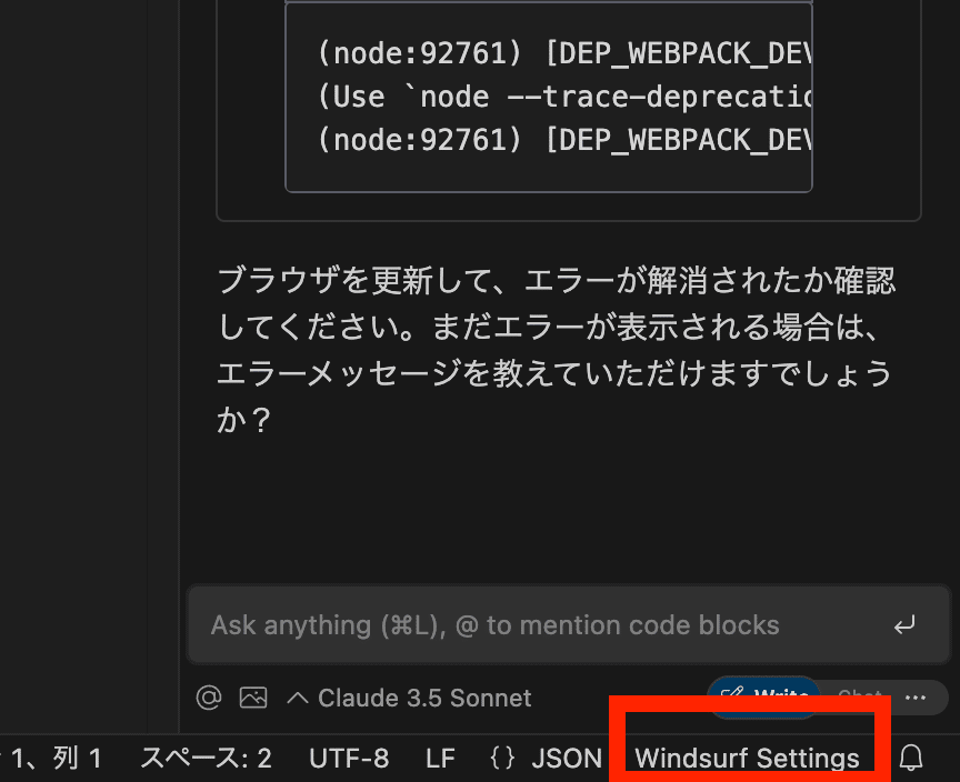 画面右下の「Windsurf Settings」をクリック。