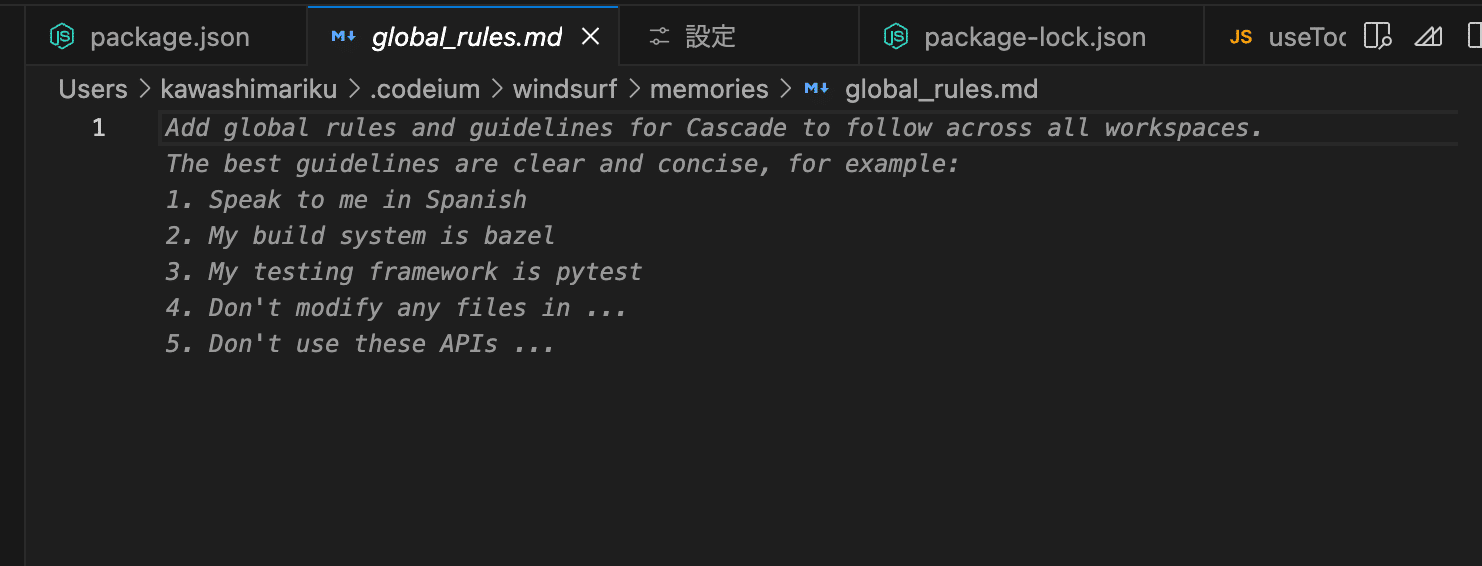 それぞれ、global_rules.md、.windsurfrulesというファイルが開くので、ここに適用したいルールを記述します。