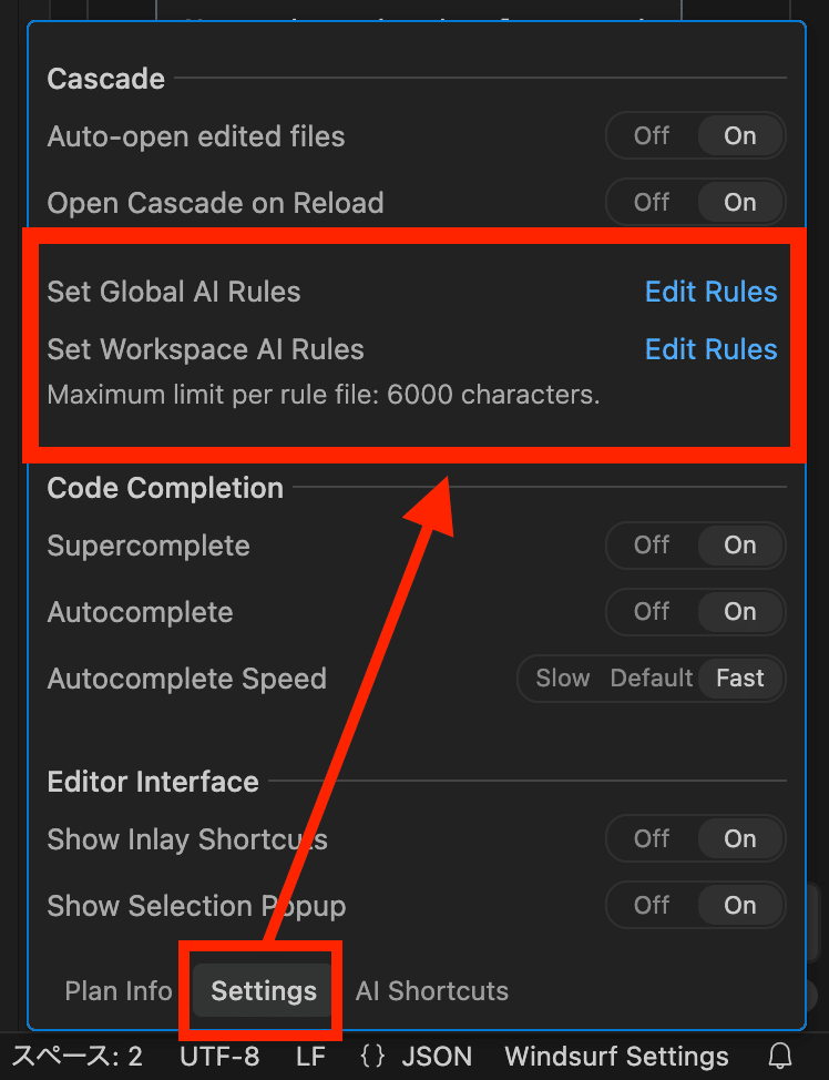 Global Rules (グローバルルール):すべてのワークスペースのCascadeに適用される