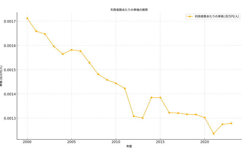 利用者数あたりの単価の推移のグラフを作成して下さい。