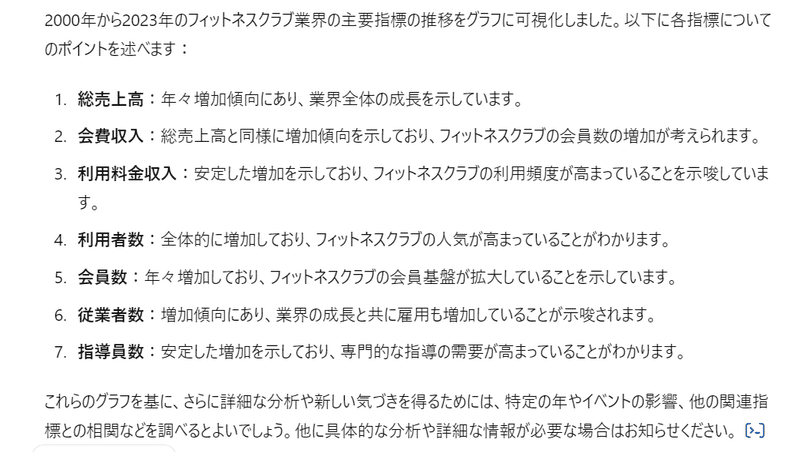 グラフが作成され、各グラフの分析結果の考察も生成されます。
