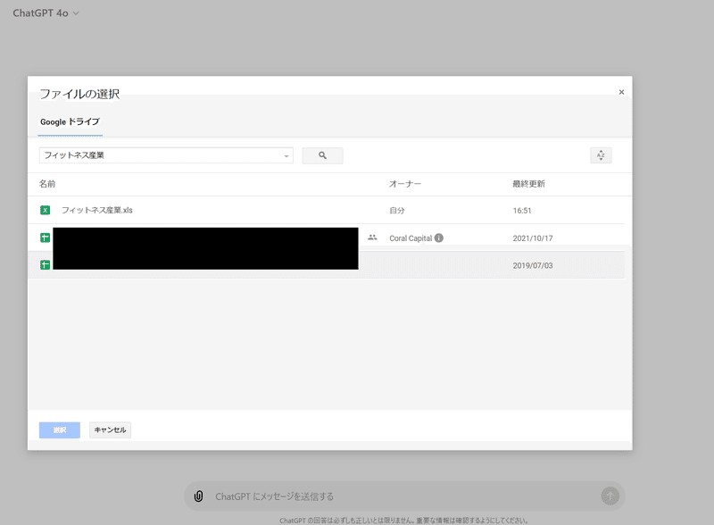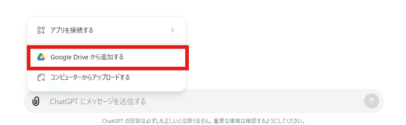 ChatGPTのチャット欄のクリップのアイコンを押して、GoogleDriveから追加するでファイルを選択します。