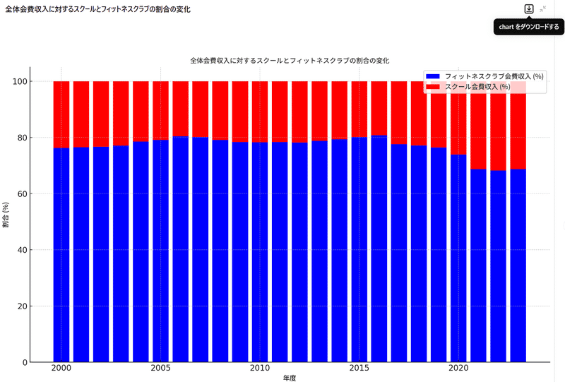 全体の会費収入を100にしたときのスクールと割合フィットネスクラブの割合の変化が見れるグラフを作成して下さい。