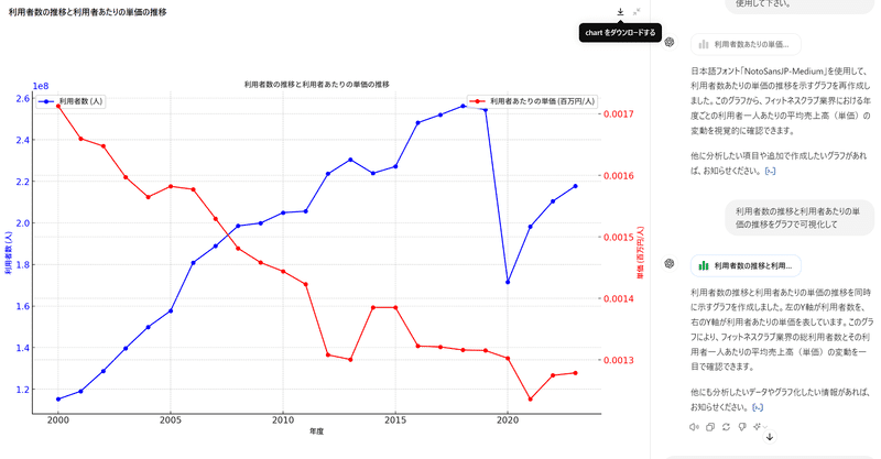 利用者数の推移と利用者あたりの単価の推移をグラフで可視化して