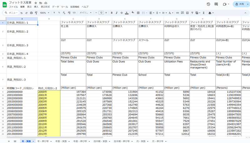 2000年から2023年のフィットネスクラブの業界動向を把握したいです。そのために必要なデータを出してグラフで可視化して下さい。 分析は多角的な角度で、新しい気づきが得られるような分析にしたいです。