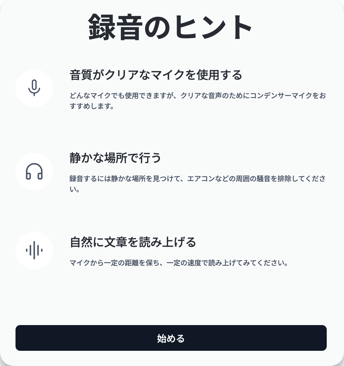 以下のように、分かりやすいUIで誰でも、スタジオなどを利用しなくても自分の声を録音してオリジナルのAI音声を作成できます。
