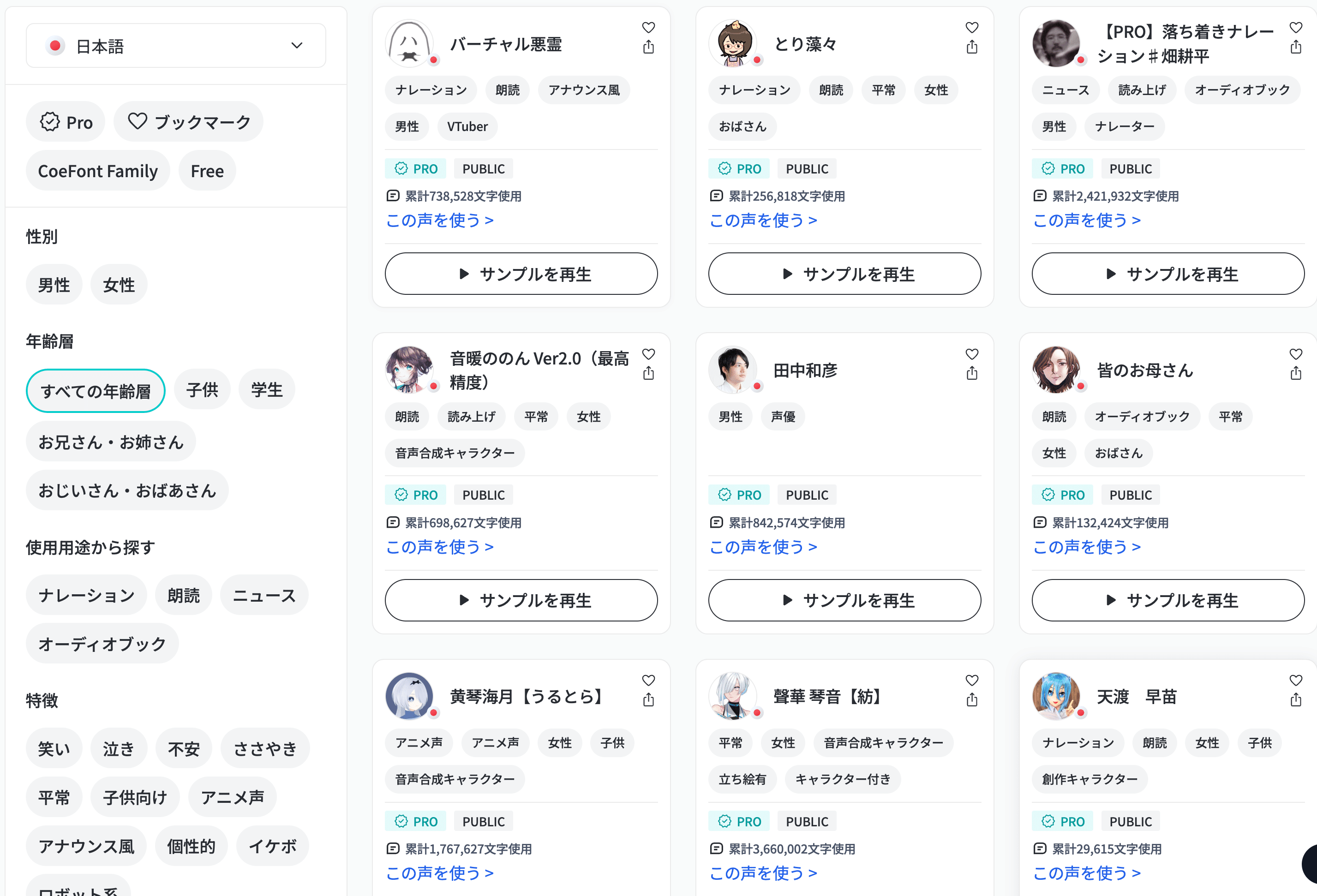 従来の音声合成では高額な費用と長時間の録音が必要でしたが、CoeFontなら無料で自然な発声のAI音声を手軽に生成できます。