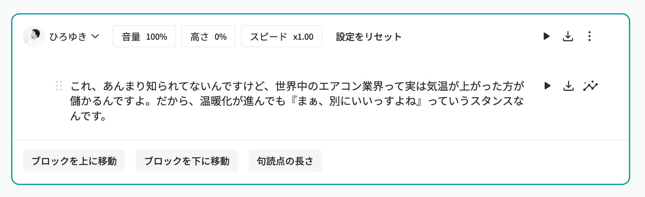 生成した音声の速度、ピッチ、音量などを細かく調整できます。
