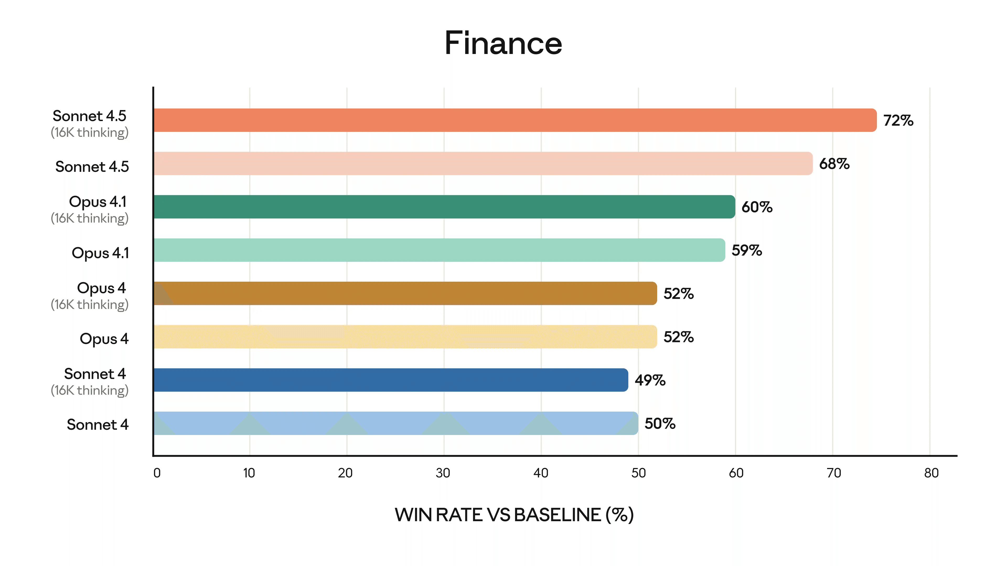 「Win Rate vs Baseline (%)」は、基準となるモデルに対する勝率を示しており、Sonnet 4.5が旧モデルや思考時間を増やした(16K thinking)バージョンも上回り、72%という高いスコアを記録。