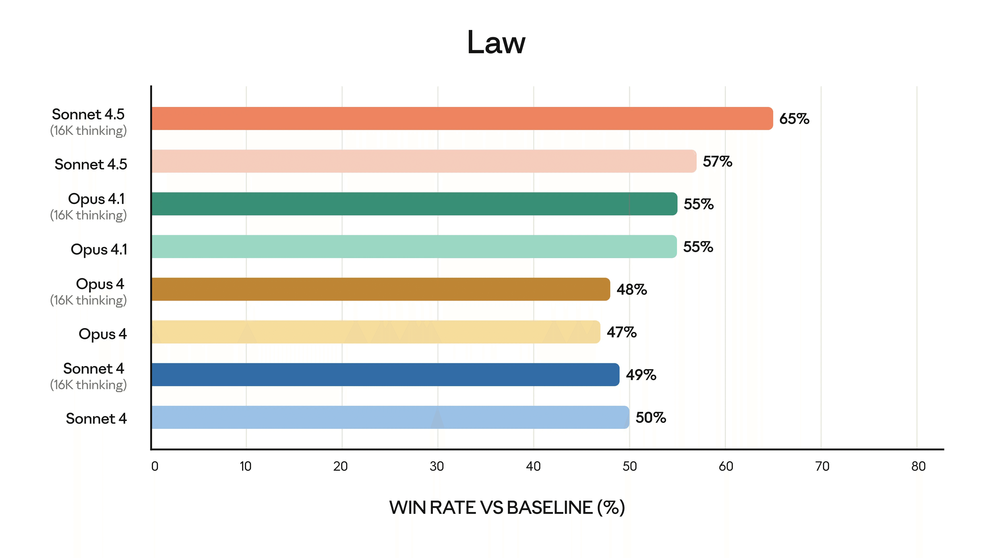 法律分野の専門家が評価した各モデルの性能比較。金融分野と同様に、基準モデルに対する勝率(Win Rate vs Baseline %)を示す。Sonnet 4.5はここでも65%という最も高いスコアを記録しており、専門的な知識とリーズニング能力が大幅に向上。