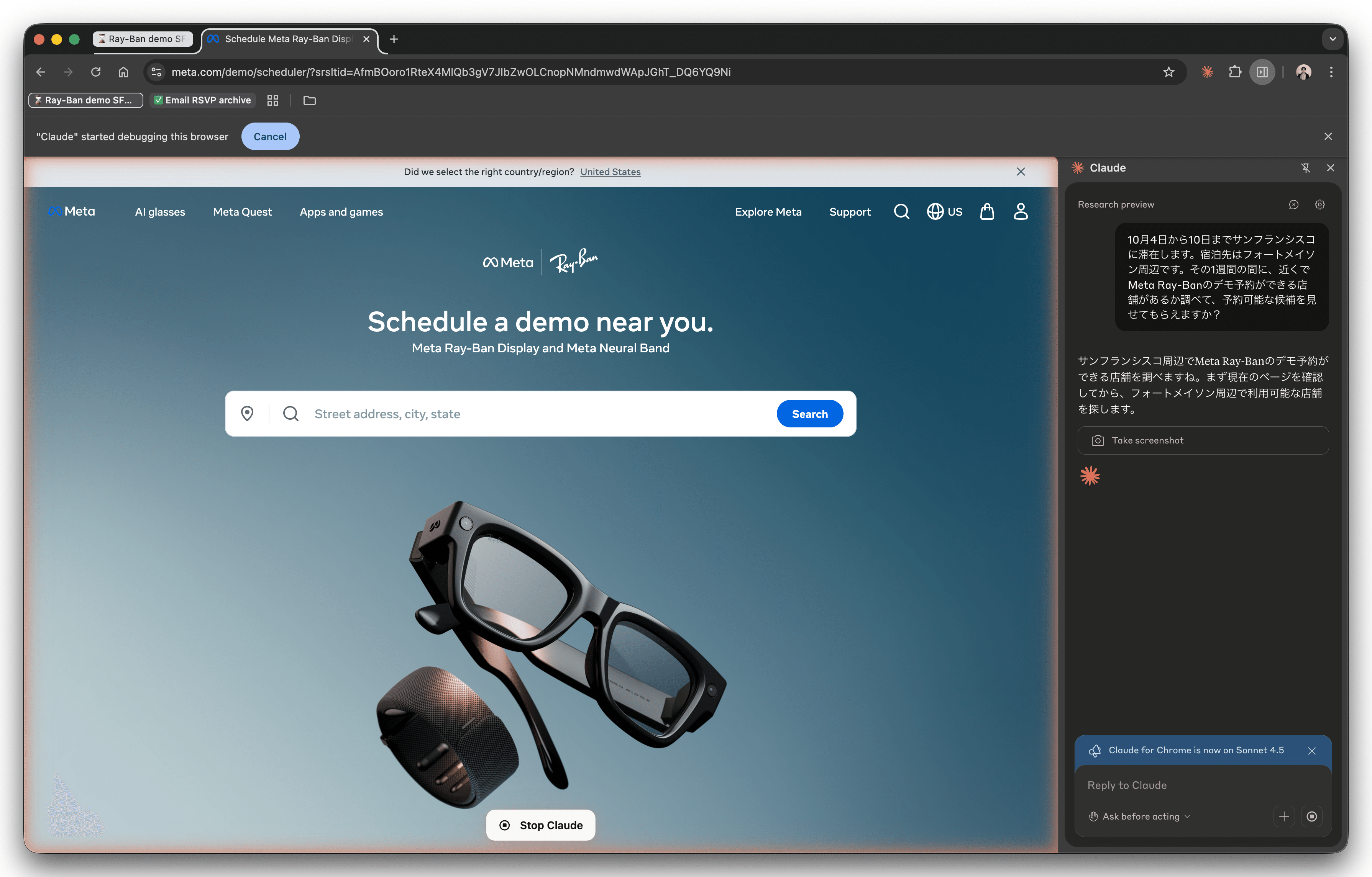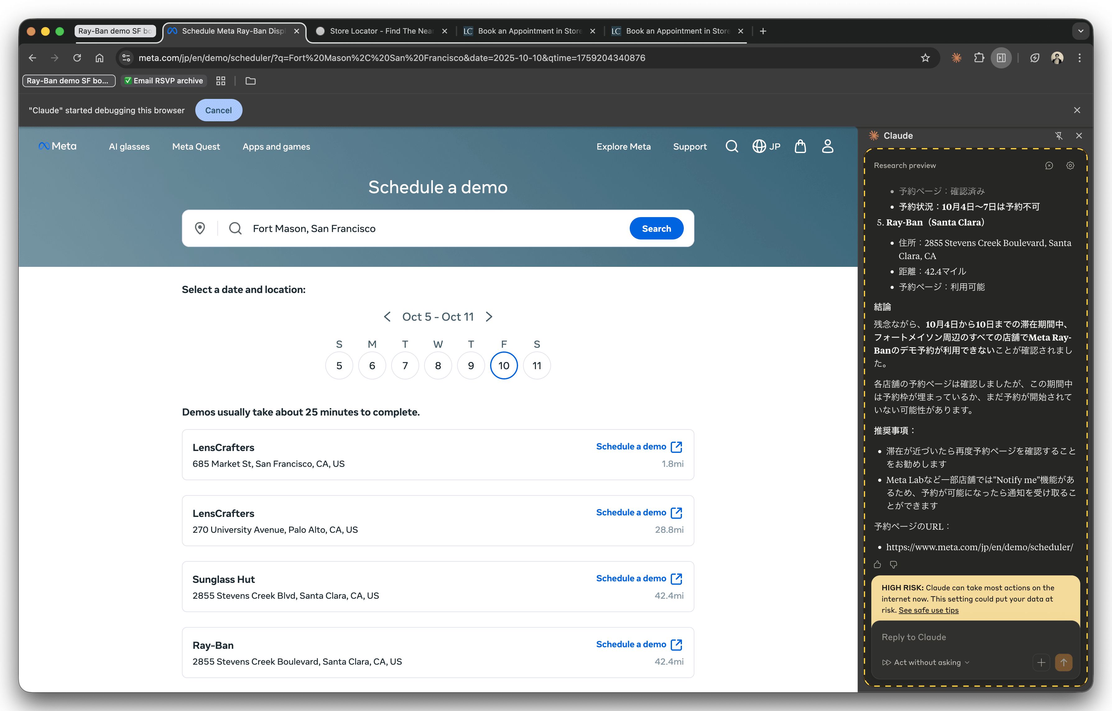 10月4日から10日までサンフランシスコに滞在します。宿泊先はフォートメイソン周辺です。その1週間の間に、近くでMeta Ray-Banのデモ予約ができる店舗があるか調べて、予約可能な候補を見せてもらえますか?各店舗の予約ページまで確認してください。