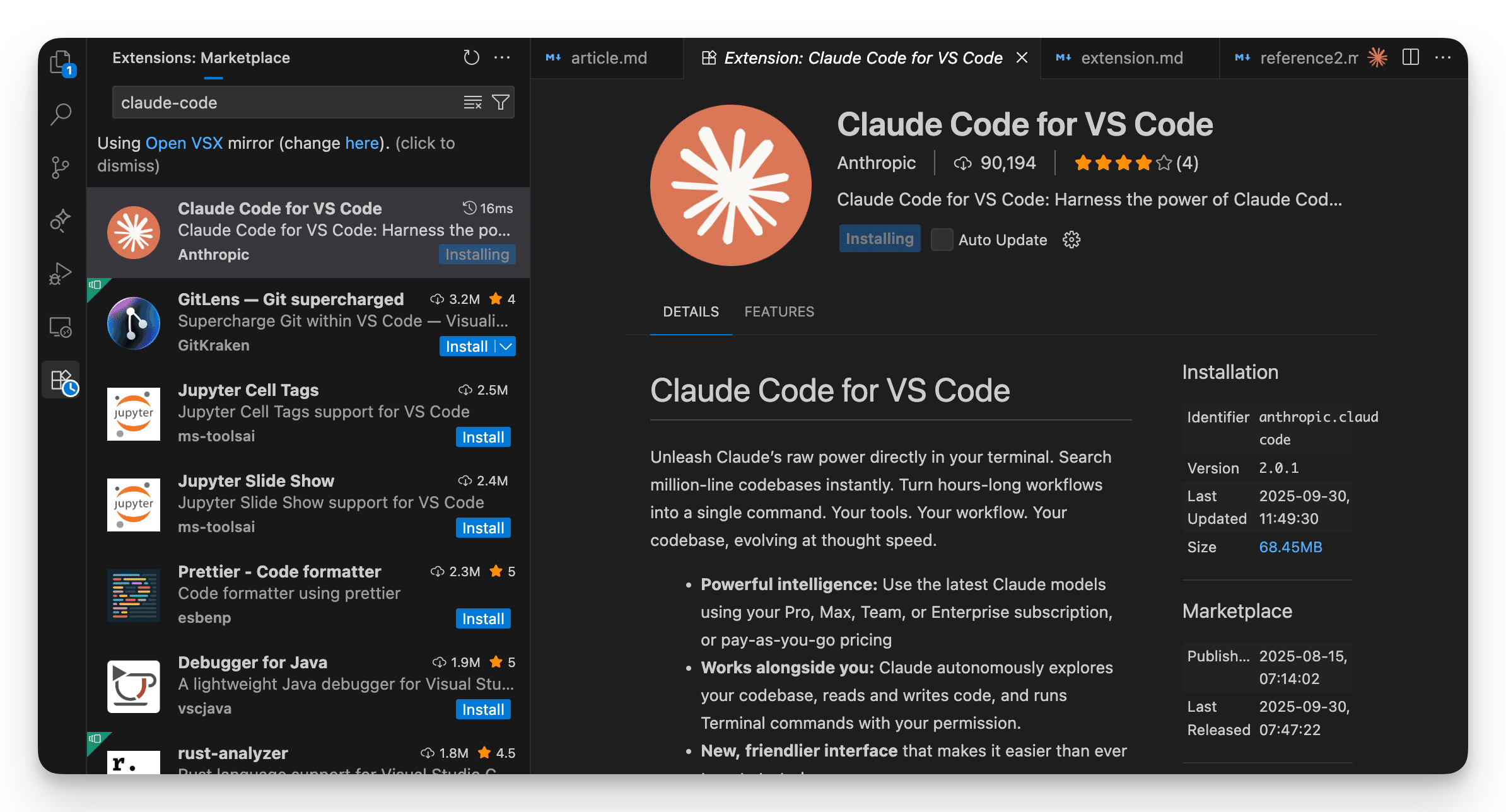 まず、VS Codeの拡張機能マーケットプレイスで「claude code」と検索し、インストールします。