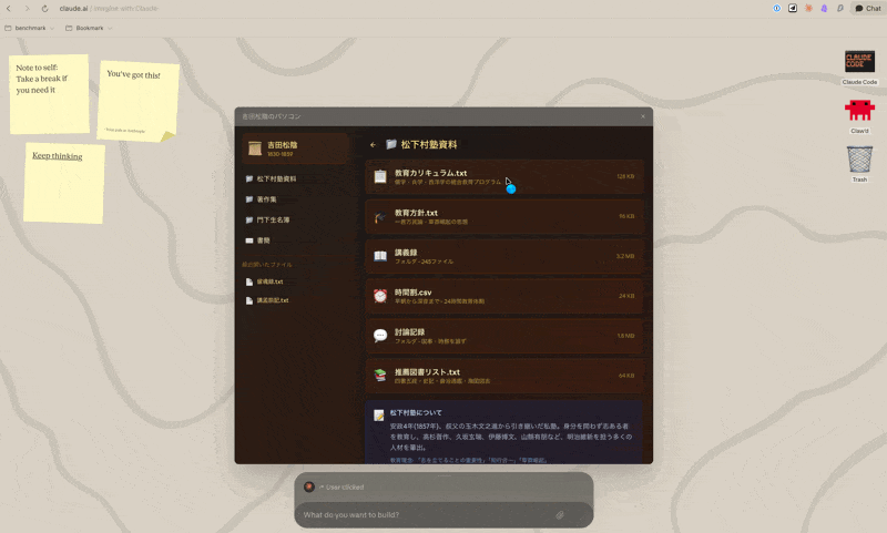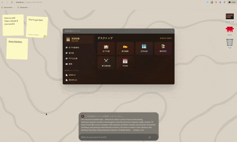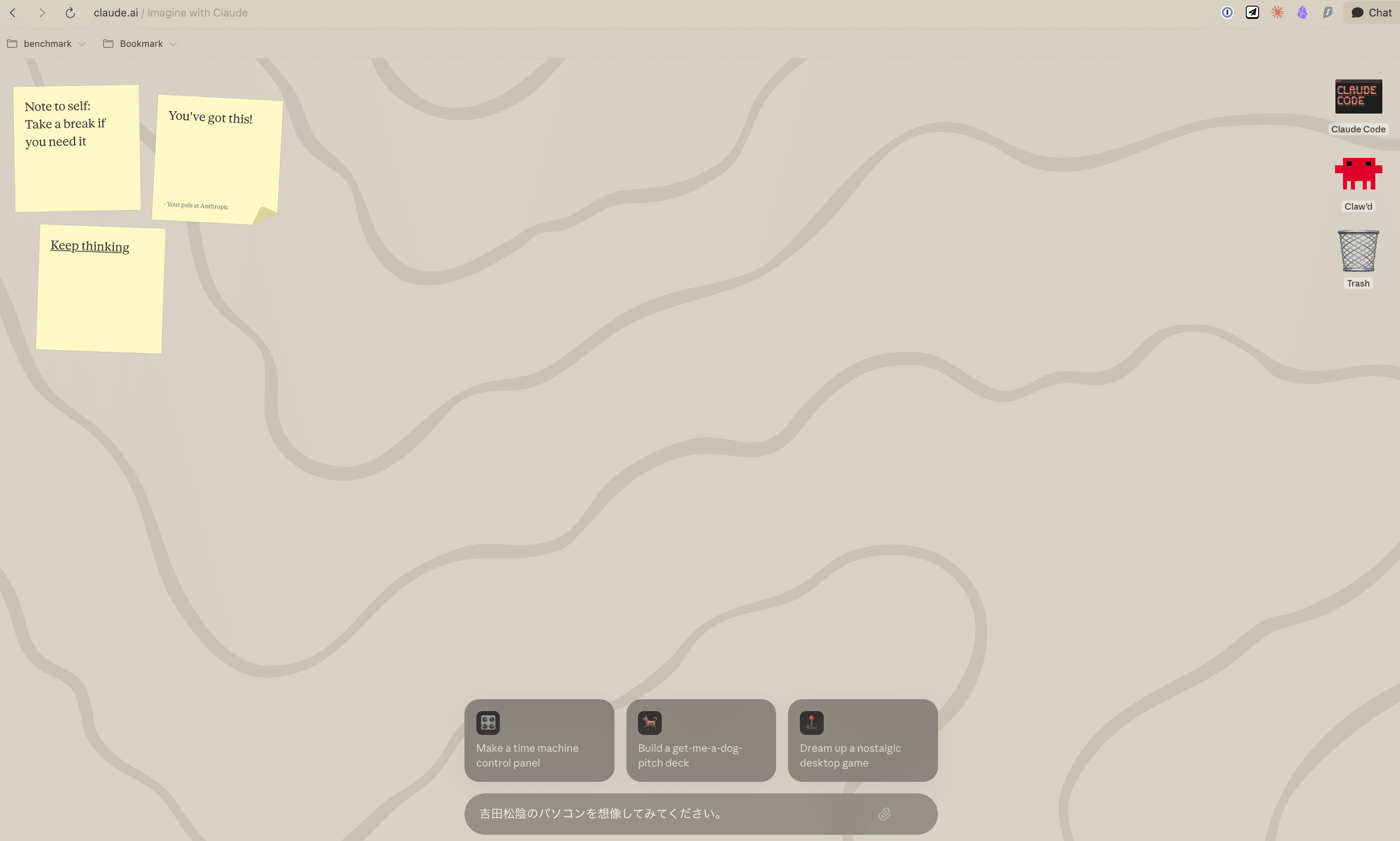 ユーザーとの対話に応じ、リアルタイムでソフトウェアをその場で生成する、実験的な研究プレビューです。claude.ai/imagineにてMaxプランユーザー向けに、5日間の期間限定で公開されています。