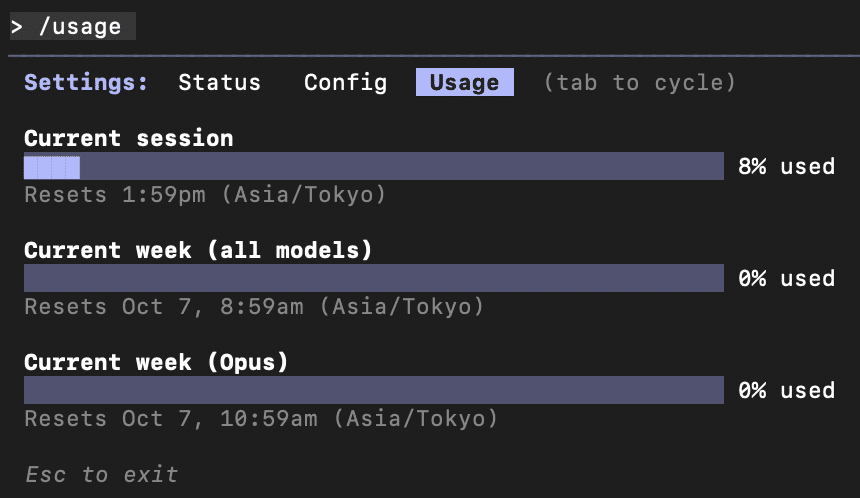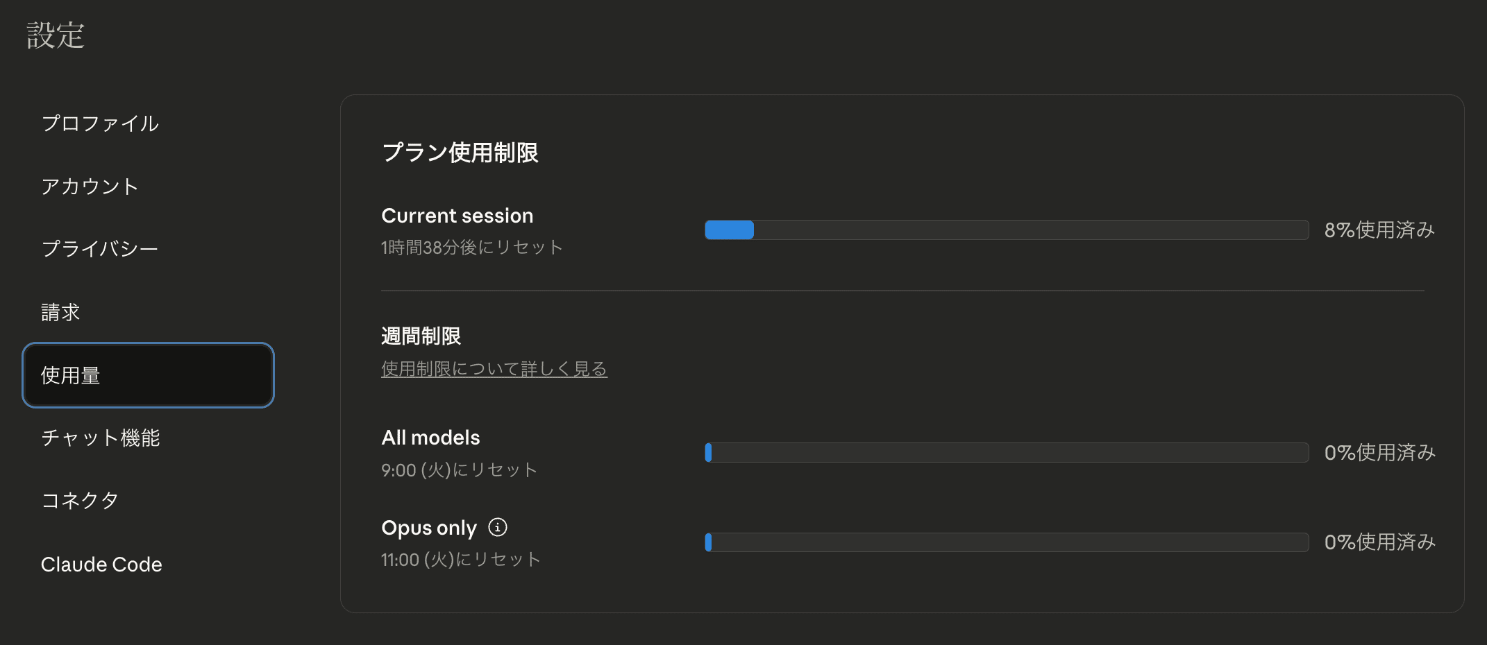 アクセス方法: Webアプリでは「設定」メニュー内の「使用状況」から、Claude Code では /usage コマンドで確認できます。