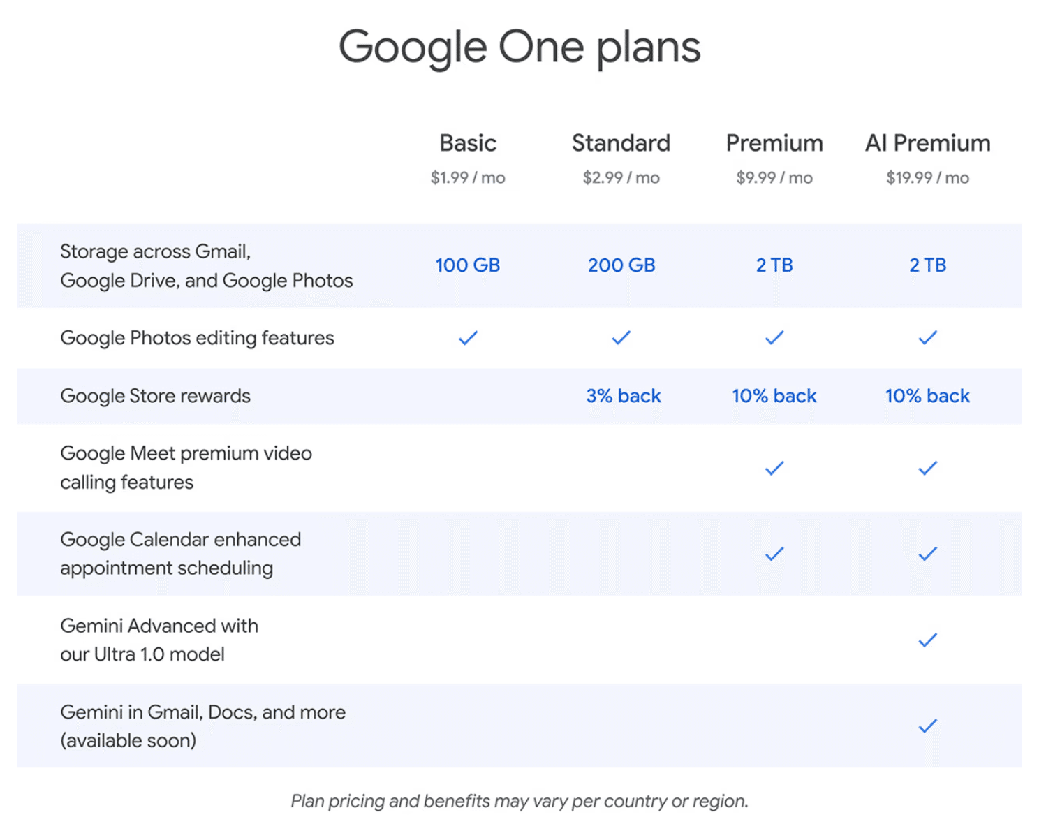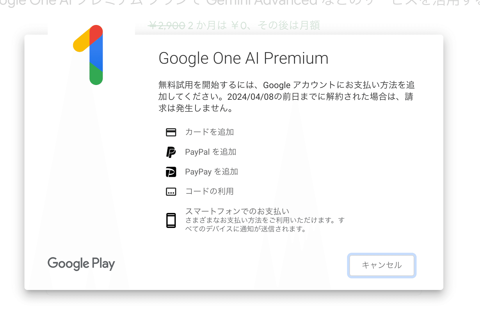 Gemini Advancedが利用できる「AI プレミアムプラン」の価格は、月額2,900円($19.99)からで2TBのストレージなどGoogle Oneサービス内容も含み最初の2ヶ月は無料で登録できます。