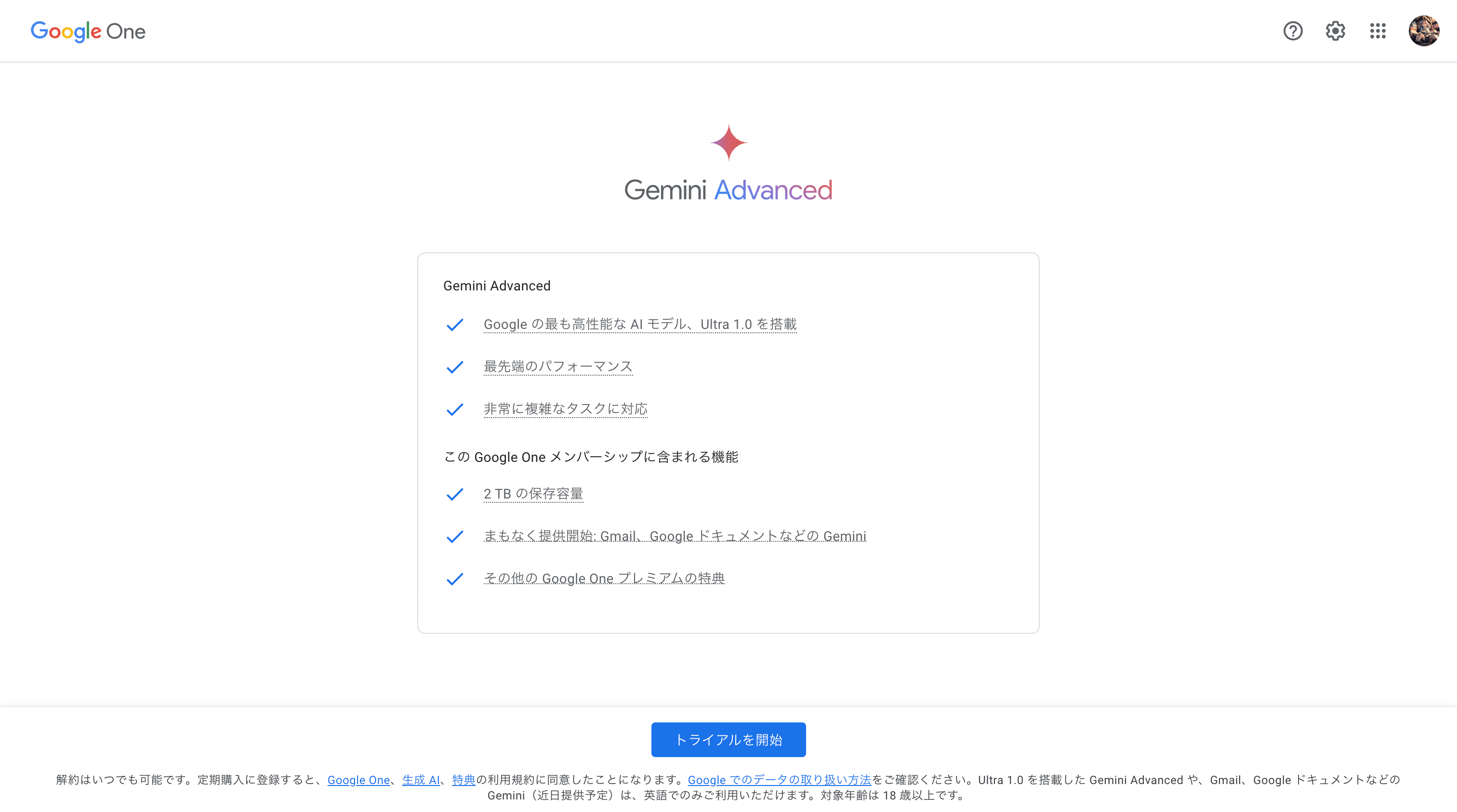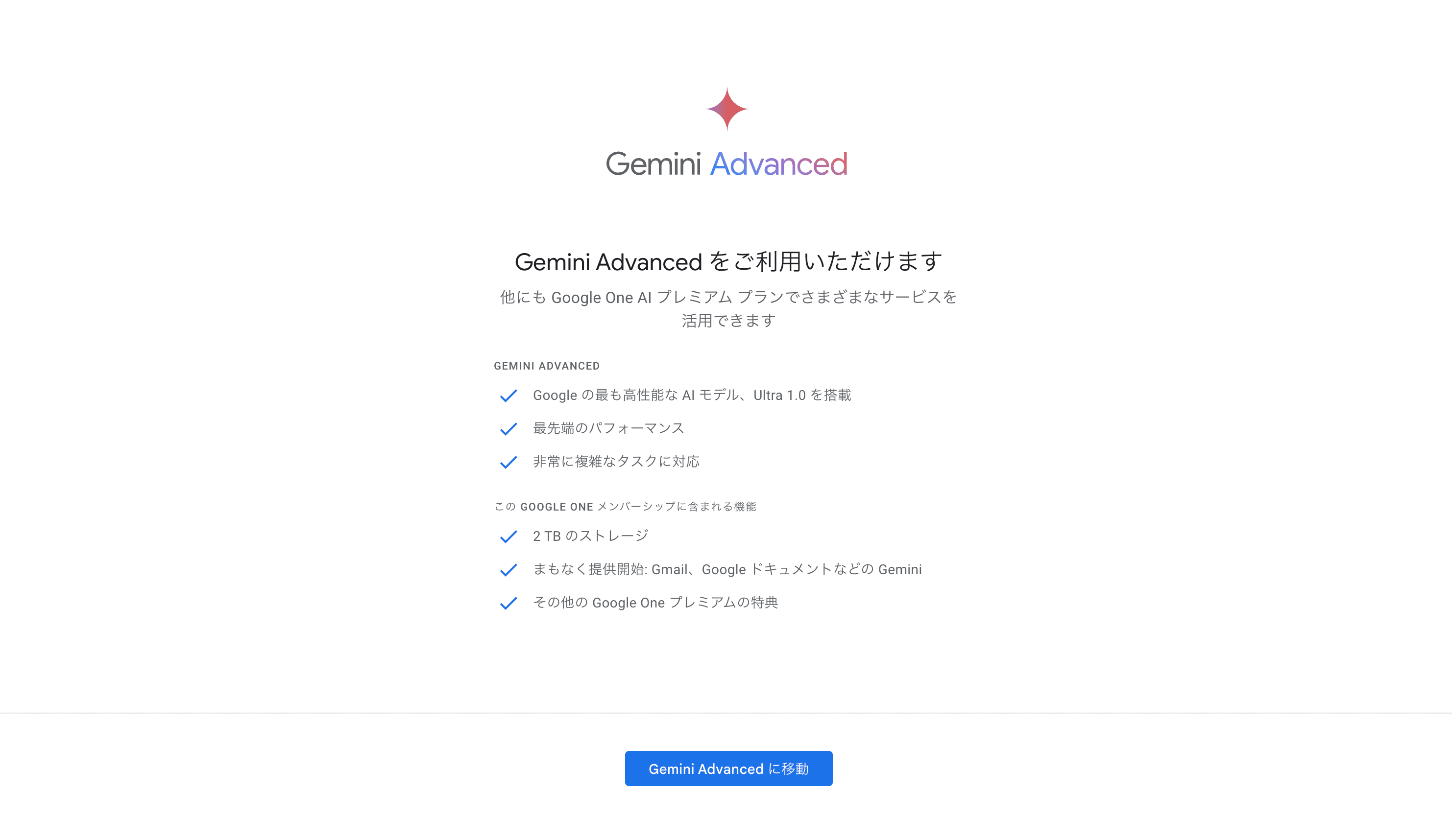 重要:Google One AIプレミアムプランの加入やGemini Advancedの利用は、日本のGoogleアカウントでも可能ですが、現状ではGemini(旧BardであるGemini Pro 1.0)を除き、日本語でのサポートは提供されていません。