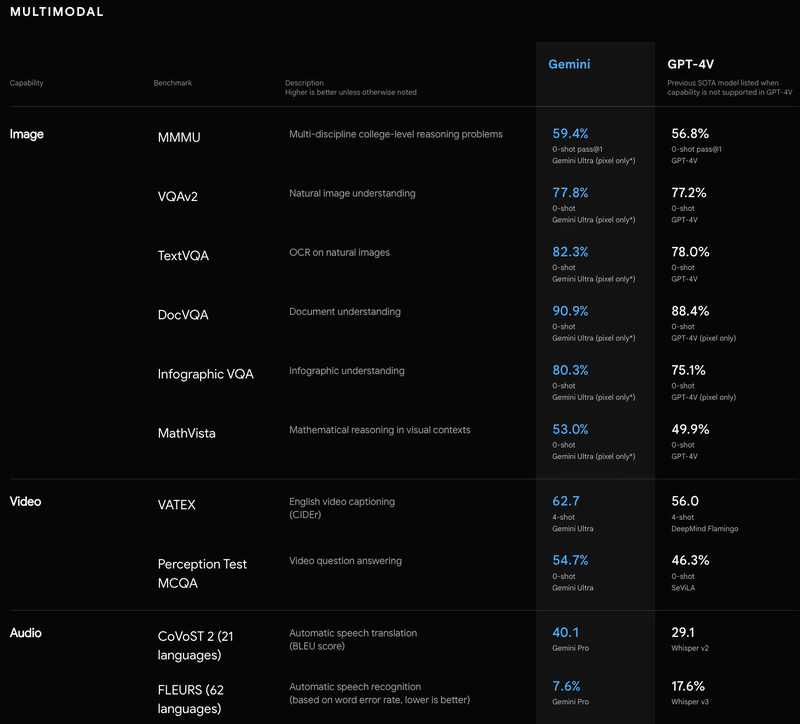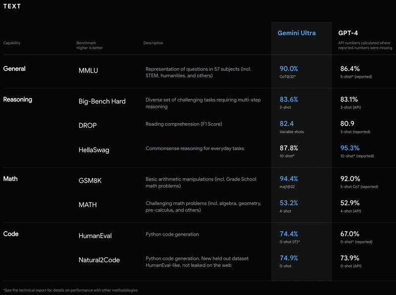 Gemini Ultraは、32の学術ベンチマーク中30で最新の成果を超えています。特に、数学、物理、歴史、法律、医学、倫理など57分野のMMLUテストで90.0%のスコアを獲得し、人間の専門家よりも優れた初のモデルになりました。さらに、マルチモーダル理解を測る新しいMMMUベンチマークでは過去最高の59.4%のスコアを達成し、OCRシステムなしで画像認識などの分野でも先行モデルを上回っています。