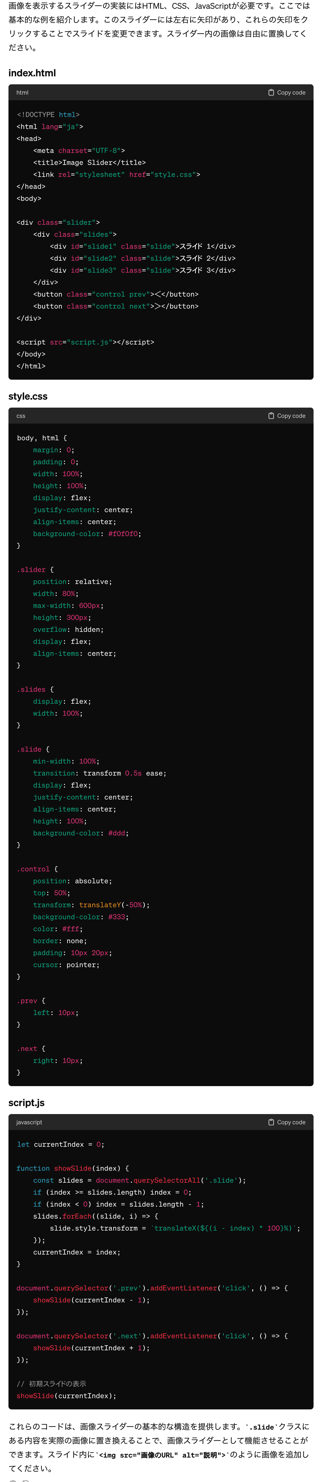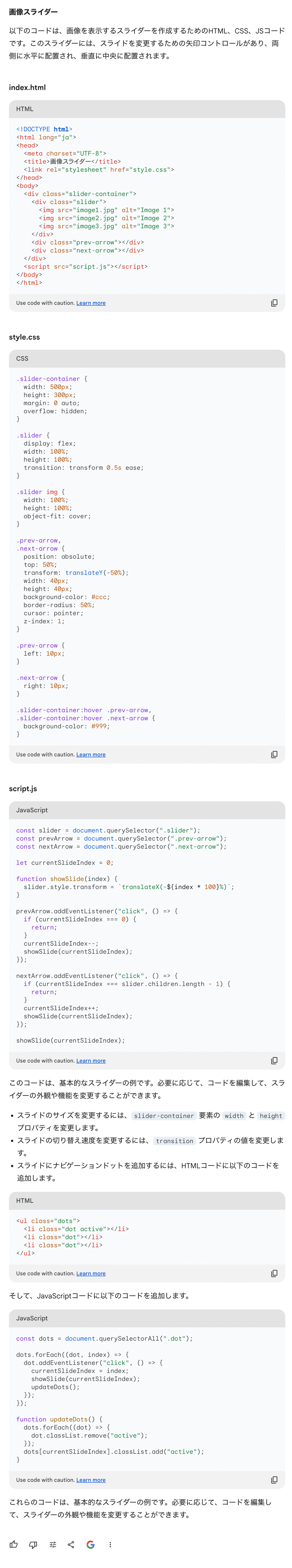 質問:画像を表示するスライダーを作るhtml, css, jsコードを出力してください。このスライダーには、スライドを変更するための矢印コントロールがあり、両側に水平に配置され、垂直に中央に配置されます。index.htmlファイル、style.cssファイル、script.jsファイルがあります。