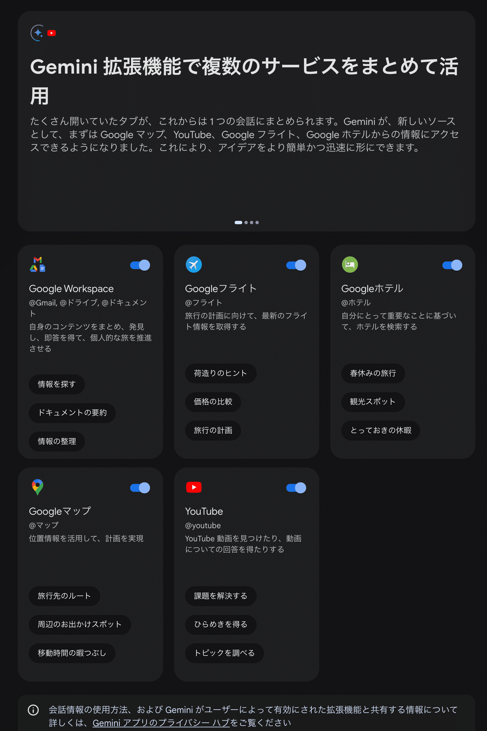 アップグレード前と同様に拡張機能でWorkspaceや、Google マップ、フライト、ホテル、YouTubeからの情報取得が可能。