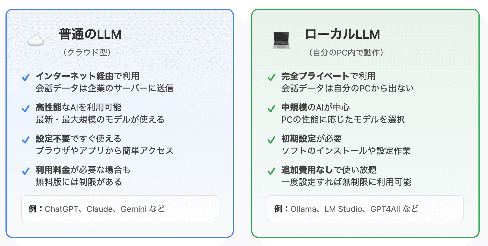 近ごろは、LLM を自分の PC で動かす「ローカル LLM」も注目されています。ローカルなら通信せずに使えるので、プライバシーを守れ、従量課金も気になりません。