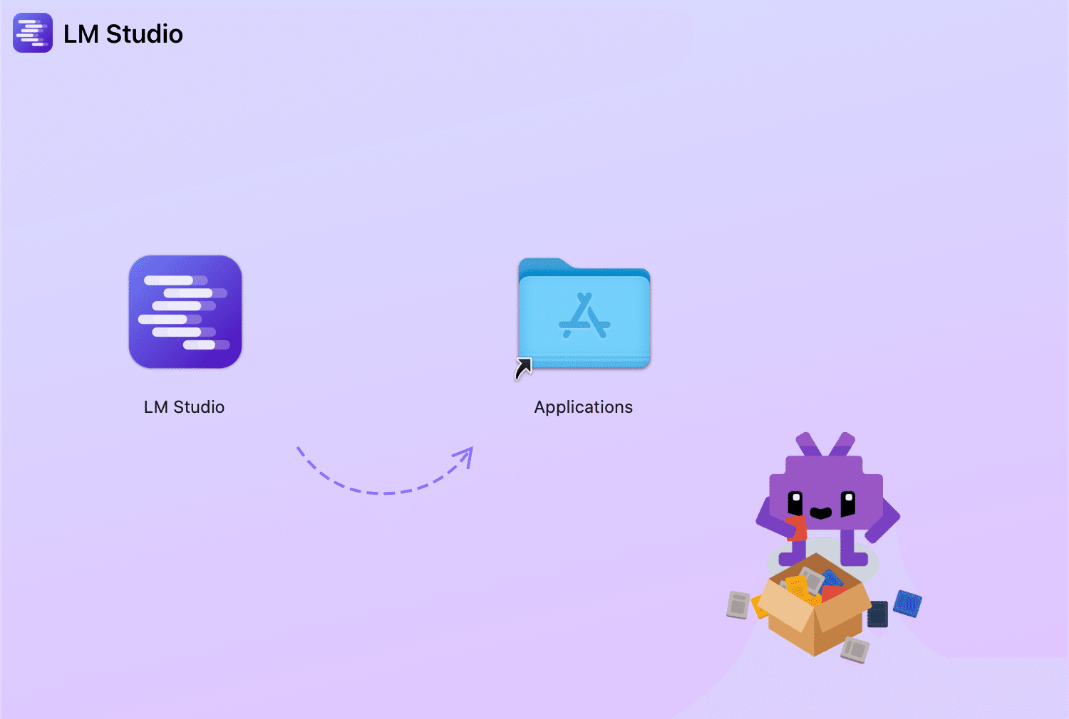 ダウンロードしたディスクイメージ(.dmgファイル)を開き、中の「LM Studio」アプリをアプリケーションフォルダへコピーすればインストール完了です。